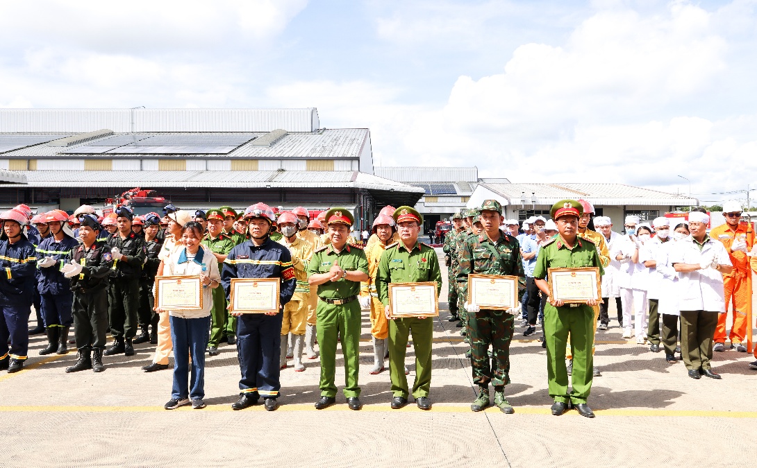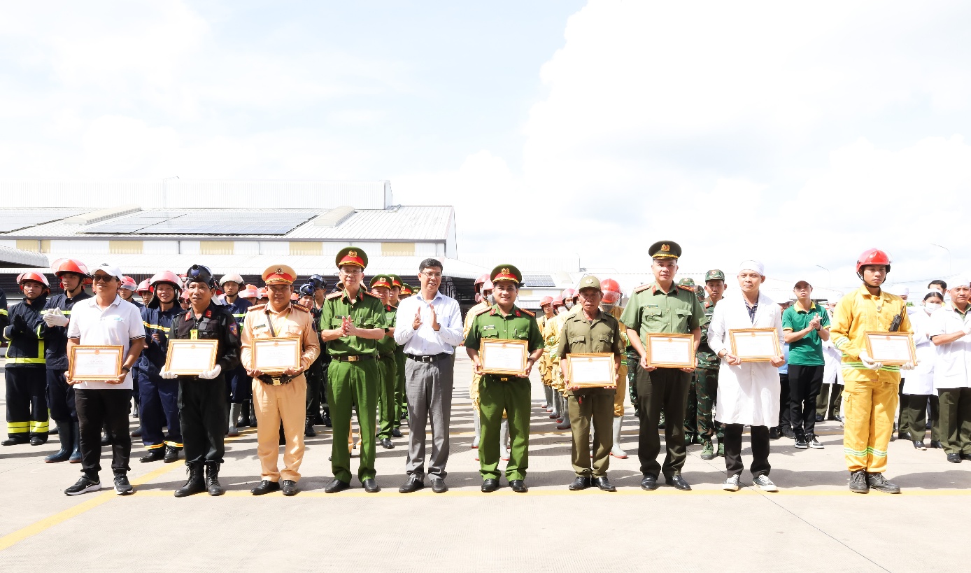 Nhân dịp này, Chủ tịch UBND thành phố đã trao tặng Bằng khen cho 01 tập thể và 05 cá nhân có thành tích tiêu biểu trong quá trình tham gia thực tập phương án chữa cháy và CNCH cấp thành phố năm 2025. Giám đốc Công an thành phố cũng đã tặng Giấy khen cho 01 tập thể và 18 cá nhân có nhiều đóng góp xuất sắc, thể hiện tinh thần trách nhiệm, chuyên nghiệp và phối hợp hiệu quả trong quá trình thực hiện nhiệm vụ.