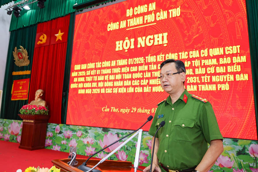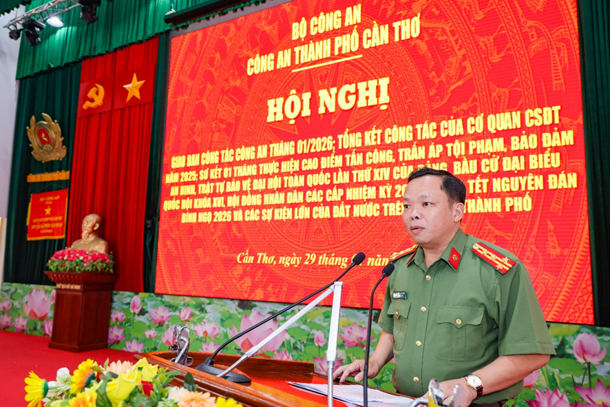 Chiều 29/01/2026, Công an thành phố Cần Thơ đã tổ chức Hội nghị sơ kết 01 tháng ra quân cao điểm tấn công, trấn áp tội phạm, bảo đảm an ninh, trật tự bảo vệ Đại hội toàn quốc lần thứ XIV của Đảng, bầu cử đại biểu Quốc hội khóa XVI, Hội đồng nhân dân các cấp nhiệm kỳ 2026 - 2031, Tết Nguyên đán Bính Ngọ 2026 và các sự kiện lớn của đất nước trên địa bàn thành phố; đồng thời tổng kết Cơ quan Cảnh sát điều tra năm 2025 và giao ban công tác tháng 01/2026.