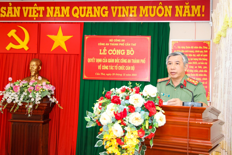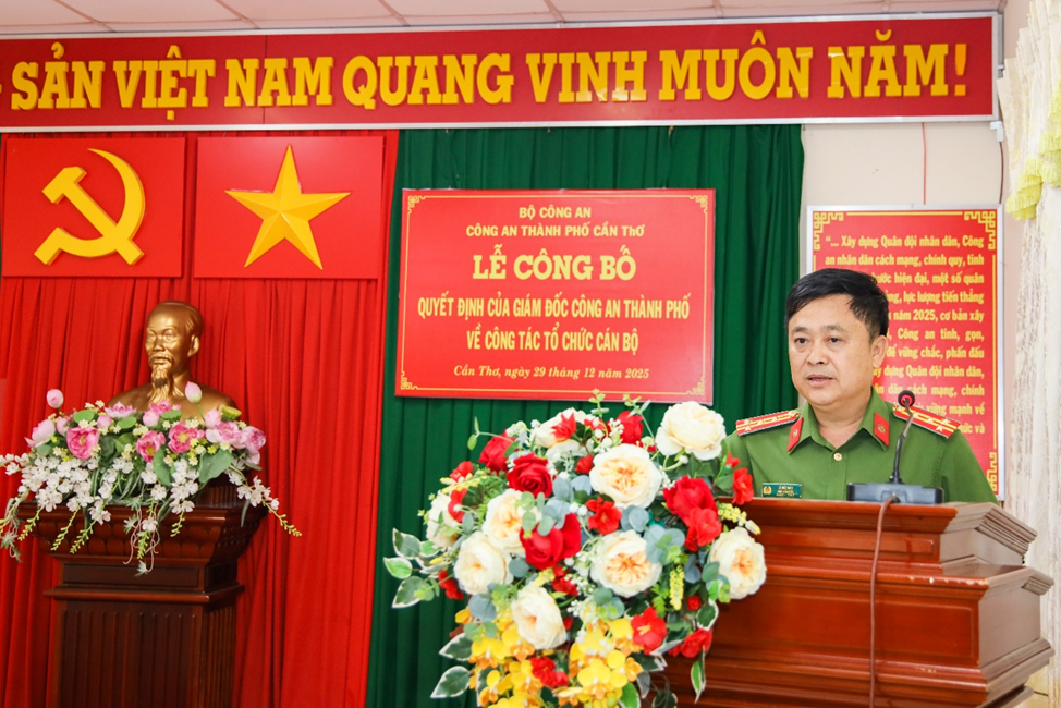 Chiều 29/12, Công an thành phố Cần Thơ tổ chức Lễ công bố và trao các Quyết định của Giám đốc Công an thành phố về công tác tổ chức cán bộ. Đồng chủ trì buổi Lễ có Đại tá Huỳnh Hoài Hận, Ủy viên BTV Đảng ủy Phó Giám đốc Công an thành phố và Đại tá Lê Đức Bảy, Ủy viên BTV Đảng ủy Phó Giám đốc Công an thành phố, cùng đại diện lãnh đạo các đơn vị trực thuộc.