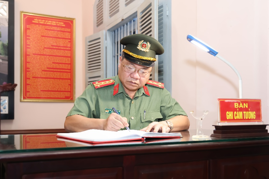 Đại tá Nguyễn Thanh Tràng, Ủy viên Ban Chấp hành Đảng bộ thành phố, Phó Bí thư Đảng ủy, Phó Giám đốc Công an thành phố ghi sổ cảm tưởng tại Nhà truyền thống lực lượng Công an Cần Thơ