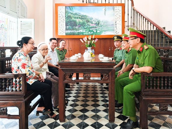 Ban Giám đốc Công an thành phố Cần Thơ trò truyện cùng với cụ Bùi Thị Tuyết Nga, em ruột của liệt sĩ Bùi Quang Trinh
