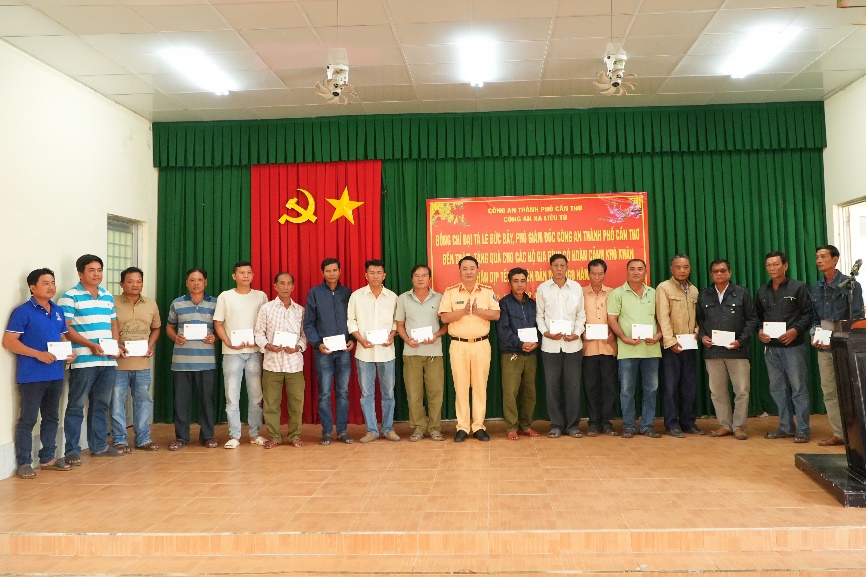 Đồng chí Đại tá Lê Đức Bảy, Ủy viên Ban Thường vụ Đảng ủy, Phó Giám đốc Công an thành phố tặng quà cho Lực lượng ANTT cơ sở và Công an xã Liêu Tú