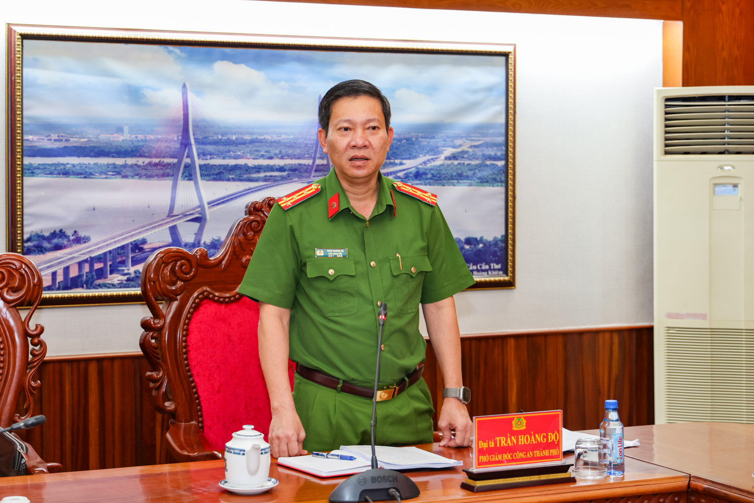 Đại tá Trần Hoàng Độ, Phó Giám đốc, Thủ trưởng Cơ quan THAHS Công an thành phố Cần Thơ phát biểu chỉ đạo tại cuộc họp