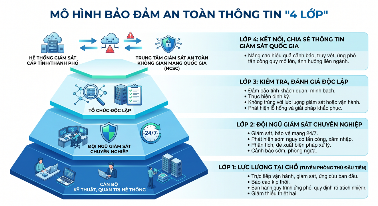 Ảnh: Minh họa mô hình bảo đảm an toàn thông tin “4 lớp”