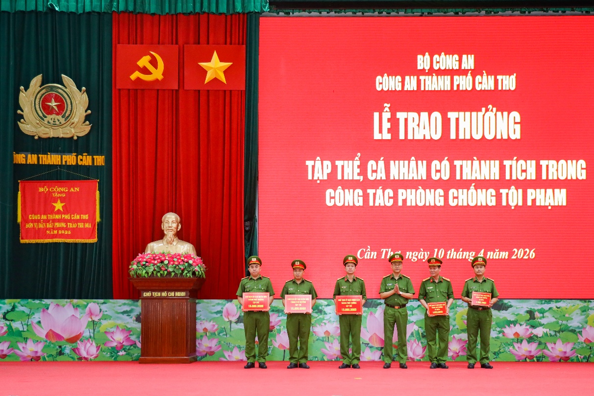 Đại tá Bùi Đức An, Phó Giám đốc Công an thành phố Cần Thơ trao thưởng cho các tập thể và cá nhân có thành tích xuất sắc trong công tác phòng chống tội phạm