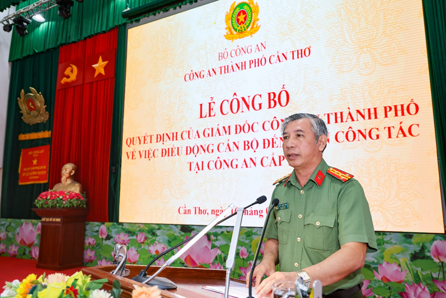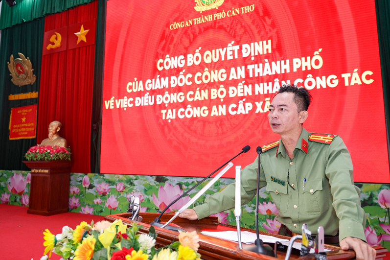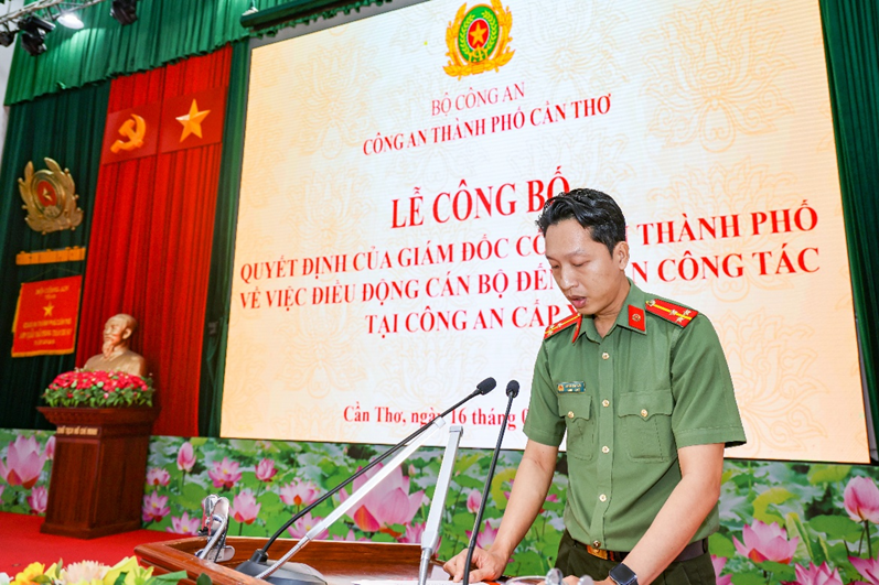 Đại diện các cán bộ được điều động, Thượng úy Huỳnh Anh Tuấn, cán bộ Phòng Tham mưu bày tỏ niềm vinh dự, tự hào khi được Ban Thường vụ Đảng ủy, lãnh đạo Công an thành phố tin tưởng giao nhiệm vụ; đồng thời nhận thức sâu sắc đây là chủ trương lớn của Đảng ủy Công an Trung ương và lãnh đạo Bộ Công an nhằm bố trí cán bộ đúng vị trí việc làm, tăng cường lực lượng cho cơ sở theo phương châm “tỉnh toàn diện, xã vững mạnh, bám cơ sở”. Trên cương vị công tác mới, thay mặt các cán bộ được điều động, đồng chí khẳng định quyết tâm giữ vững bản lĩnh chính trị, phẩm chất đạo đức, danh dự và truyền thống của lực lượng Công an nhân dân; nhanh chóng bàn giao công việc, khẩn trương nhận nhiệm vụ tại đơn vị mới, nêu cao tinh thần trách nhiệm, khắc phục khó khăn, đoàn kết, thực hiện nghiêm phong trào thi đua “Ba nhất - Kỷ luật nhất, Trung thành nhất, Gần dân nhất”, phấn đấu hoàn thành tốt mọi nhiệm vụ được giao. Qua đó, góp phần giữ vững an ninh chính trị, trật tự an toàn xã hội trên địa bàn, trong đó tập trung bảo đảm tuyệt đối an ninh, an toàn các nhiệm vụ chính trị quan trọng trong thời gian tới; trước mắt là bảo vệ tuyệt đối an ninh, an toàn Đại hội đại biểu toàn quốc lần thứ XIV của Đảng, bầu cử đại biểu Quốc hội khóa XVI, Hội đồng nhân dân các cấp nhiệm kỳ 2026 - 2031 và Tết Nguyên đán Bính Ngọ 2026.