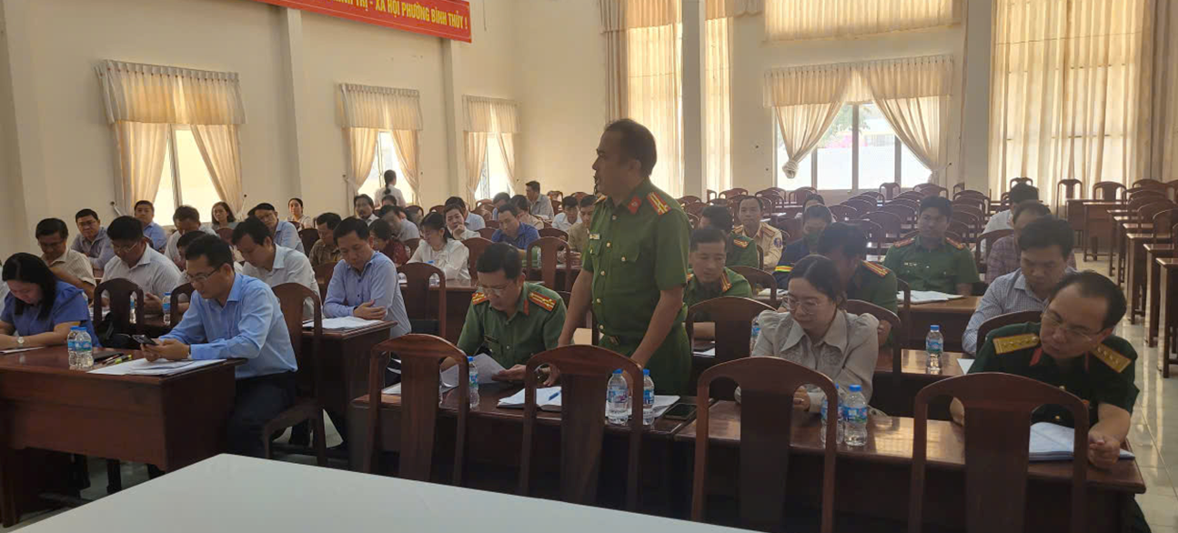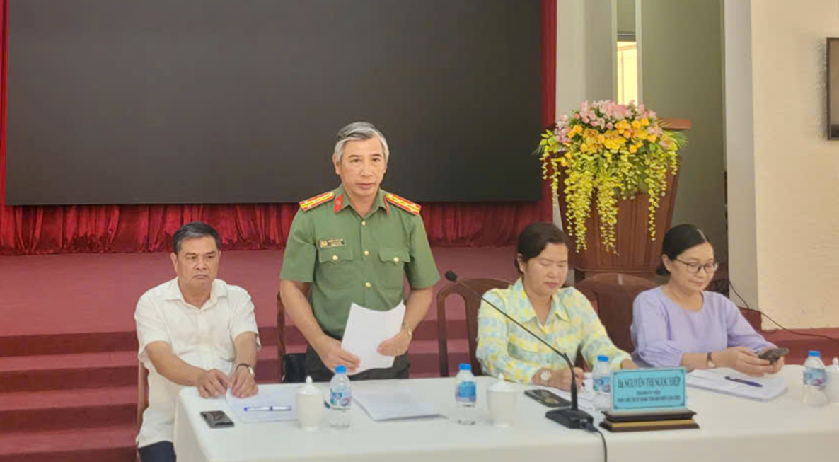Đồng chí Đại tá Huỳnh Hoài Hận, Phó Giám đốc Công an thành phố phát biểu tại cuộc họp