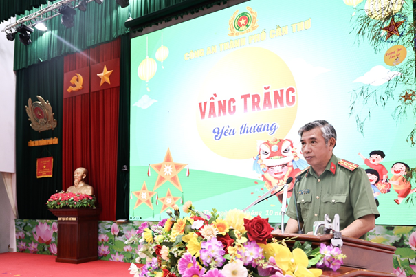 Đại tá Huỳnh Hoài Hận, Ủy viên Ban Thường vụ Đảng ủy, Phó Giám đốc Công an thành phố, phát biểu chúc mừng Tết Trung thu các cháu thiếu nhi