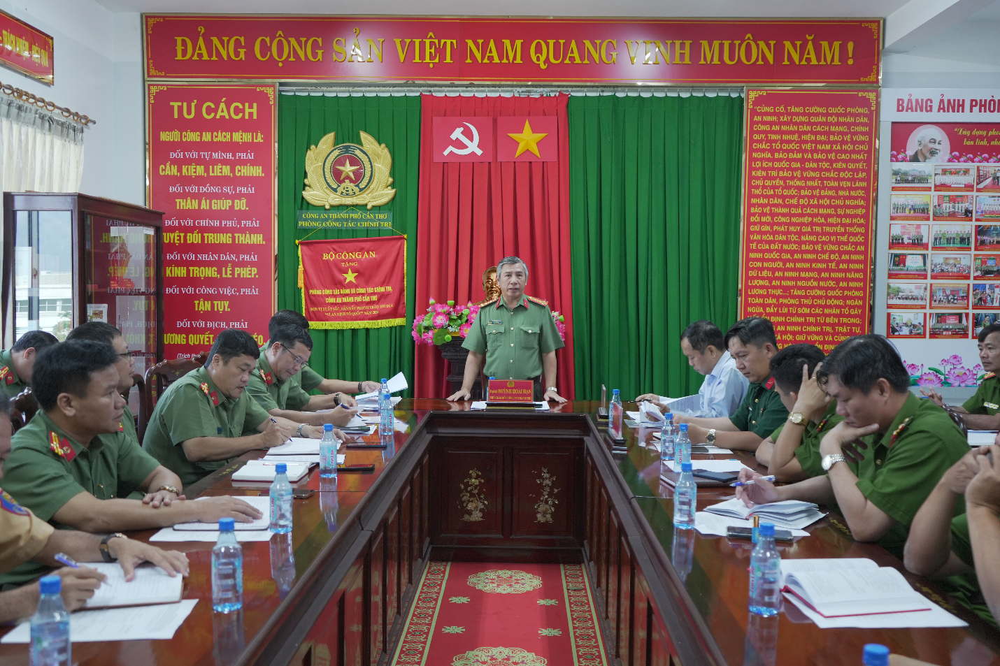 Để chủ động trong công tác triển khai lực lượng bảo đảm an ninh, trật tự các hoạt động Lễ hội, sự kiện, đồng chí Đại tá Huỳnh Hoài Hận, Phó Giám đốc Công an thành phố chỉ đạo Công an các đơn vị, địa phương tiếp tục quán triệt thực hiện nghiêm các nhiệm vụ được phân công, chủ động phối hợp tăng cường công tác tuần tra kiểm soát, trấn áp các loại tội phạm, kiên quyết xử lý các hành vi vi phạm pháp luật; nắm chắc tình hình và tham mưu giải quyết các tình huống liên quan an ninh, trật tự từ cơ sở không để ảnh hưởng đến các hoạt động của Lễ hội, sự kiện; đảm bảo an toàn công tác phòng cháy, chữa cháy; đảm bảo công tác trật tự an toàn giao thông; thực hiện nghiêm công tác trực, ứng trực chuẩn bị lực lượng, phương tiện nhằm đảm bảo tuyệt đối an ninh, an toàn các hoạt động, sự kiện, tạo điều kiện thuận lợi cho đại biểu, Nhân dân tham dự Giỗ tổ Hùng Vương năm 2026, Lễ hội Bánh dân gian Nam Bộ lần thứ XIII năm 2026 và các hoạt động kỷ niệm 51 năm ngày Giải phóng miền Nam, thống nhất đất nước (30/4/1975 - 30/4/2026), Ngày Quốc tế Lao động 1/5 và 136 năm Ngày sinh Chủ tịch Hồ Chí Minh (19/5/1890 - 19/5/2026). Đồng thời, trong Hội nghị, đồng chí Phó Giám đốc cũng nhấn mạnh: “cán bộ, chiến sỹ khi tham gia bảo đảm an ninh, trật tự các hoạt động Lễ hội, sự kiện phải chấp hành nghiêm nhiệm vụ được phân công, điều lệnh Công an nhân dân, giữ gìn lễ tiết, tác phong, lề lối làm việc, văn hóa ứng xử, phấn đấu hoàn thành tốt nhiệm vụ được giao”.