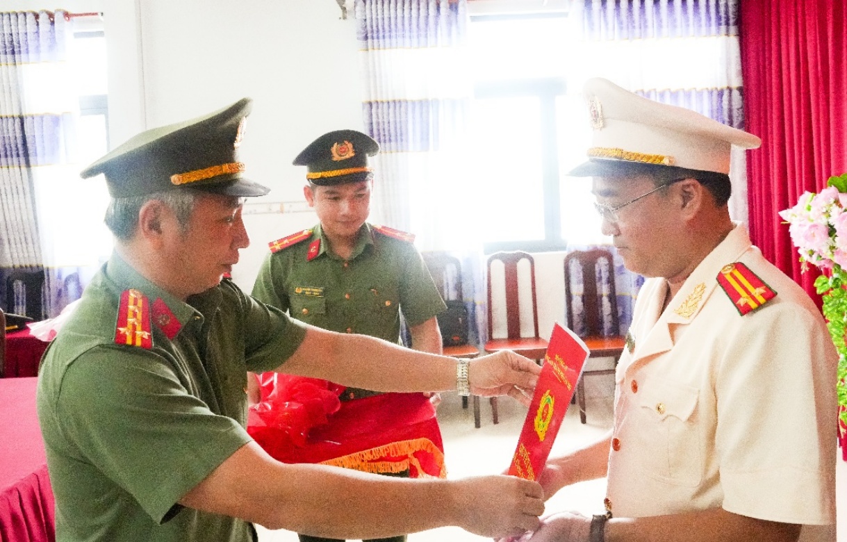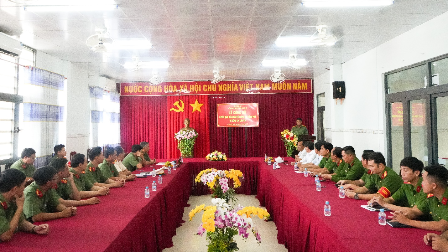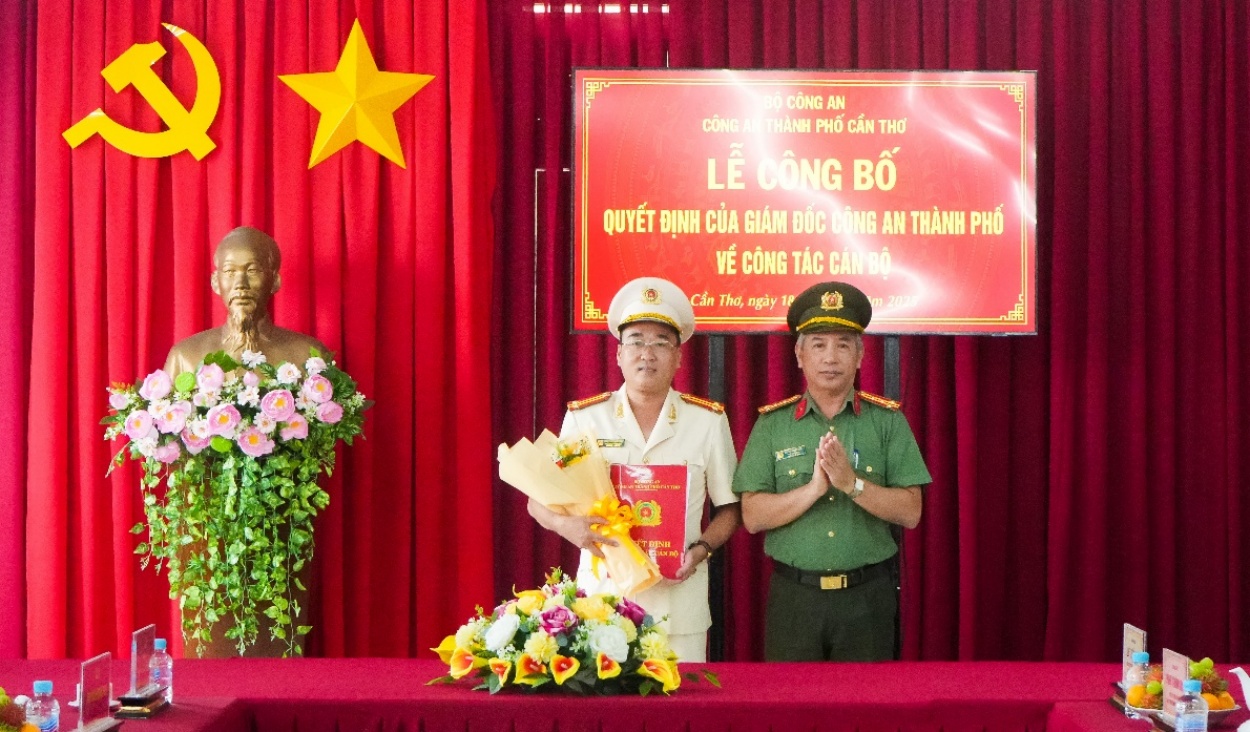 Đồng chí Đại tá Huỳnh Hoài Hận, Ủy viên Ban Thường vụ Đảng ủy, Phó Giám đốc Công an thành phố trao quyết định điều động và tặng hoa chúc mừng Trung tá Nguyễn Thanh Hậu