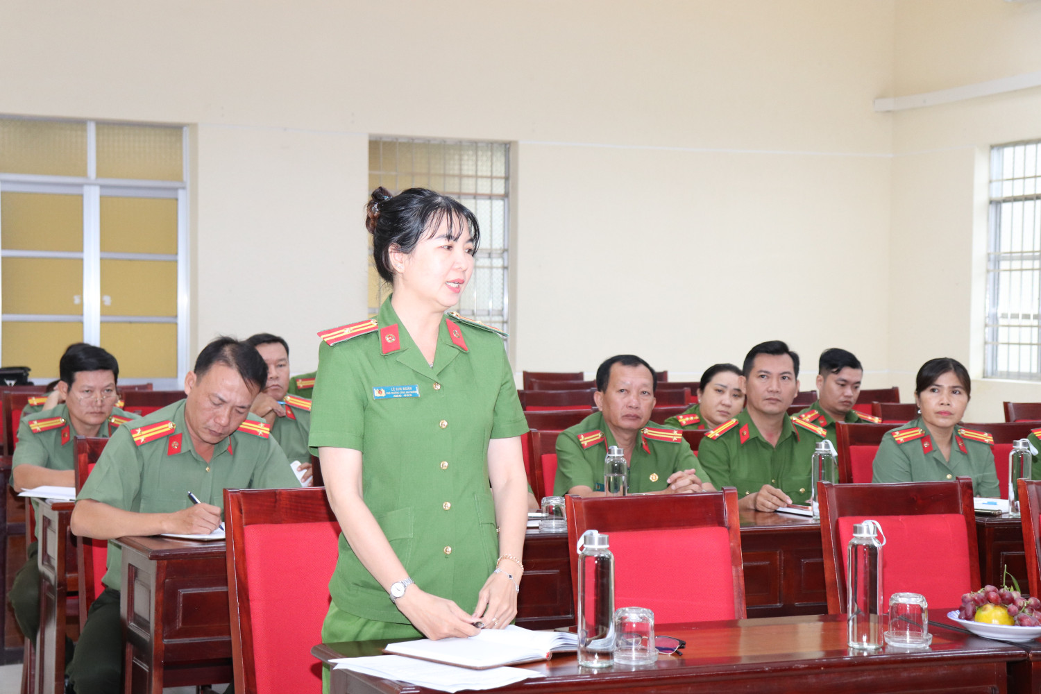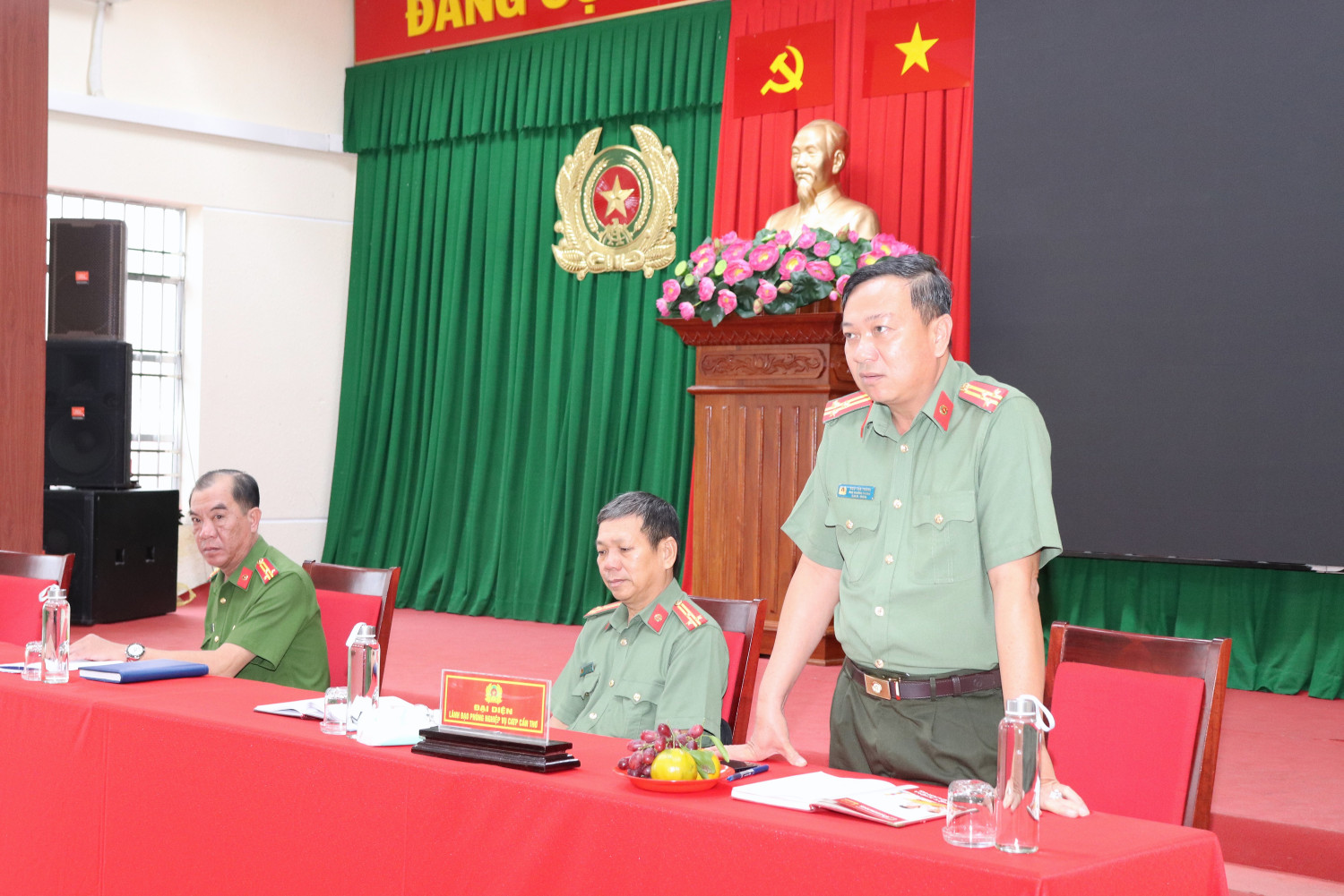 Đại diện lãnh đạo Phòng Công tác chính trị phát biểu tại buổi làm việc với Công an phường Phú Lợi.