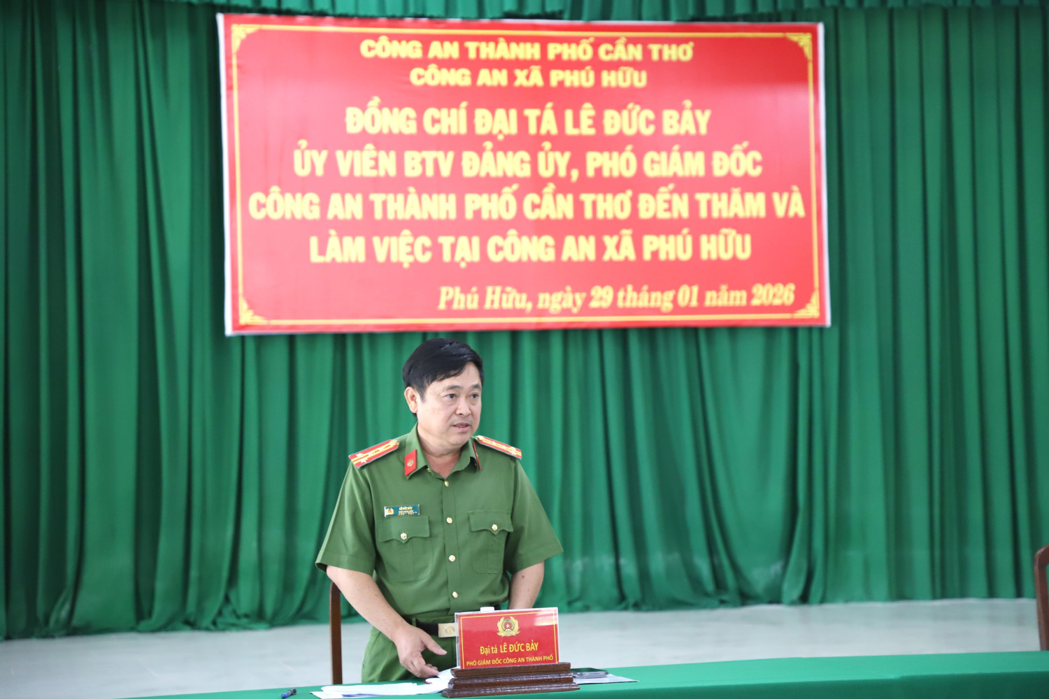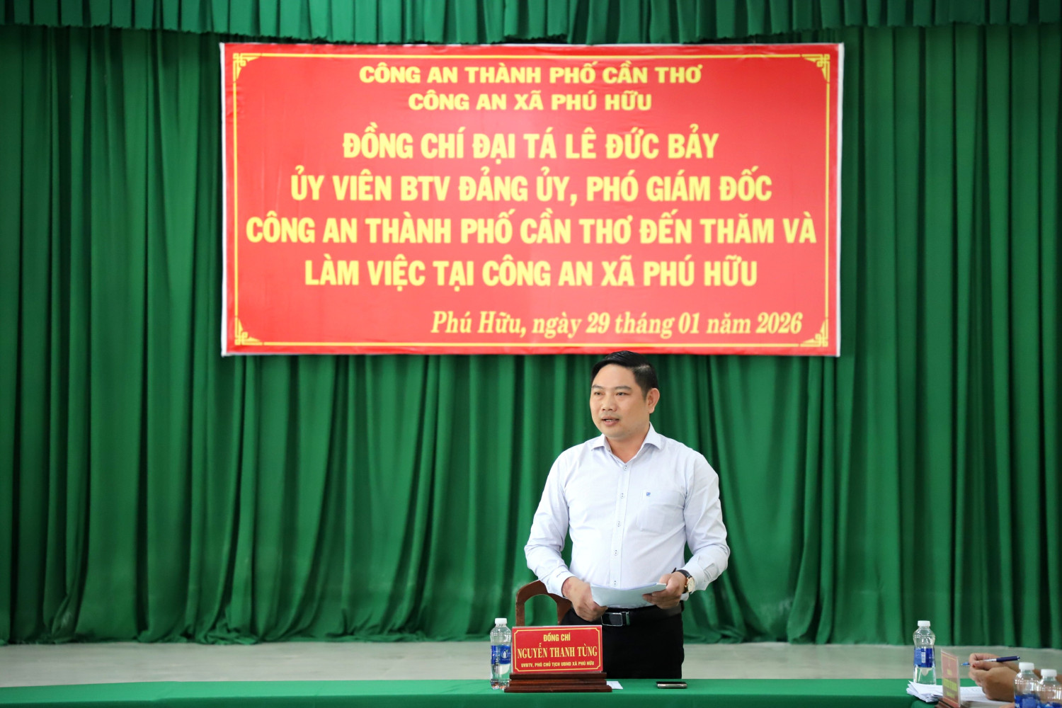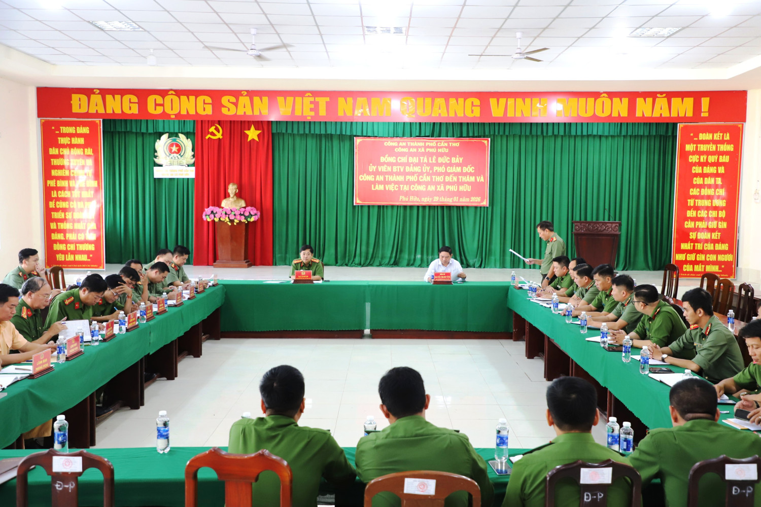 Nhằm đánh giá tình hình, kết quả thực hiện các mặt công tác Công an trong thời gian qua và định hướng nhiệm vụ trọng tâm trong thời gian tới, ngày 29/01/2026, đoàn công tác của Công an thành phố Cần Thơ do Đại tá Lê Đức Bảy, Ủy viên Ban Thường vụ Đảng ủy, Phó Giám đốc Công an thành phố làm trưởng đoàn đã có buổi làm việc với Công an xã Phú Hữu.Dự buổi làm việc, có đồng chí Nguyễn Thanh Tùng, Ủy viên Ban Thường vụ Đảng ủy xã, Phó Chủ tịch Ủy ban nhân dân xã Phú Hữu, các đồng chí trong Ban Chỉ huy, cán bộ Công an xã và đại diện các đơn vị nghiệp vụ Công an thành phố.