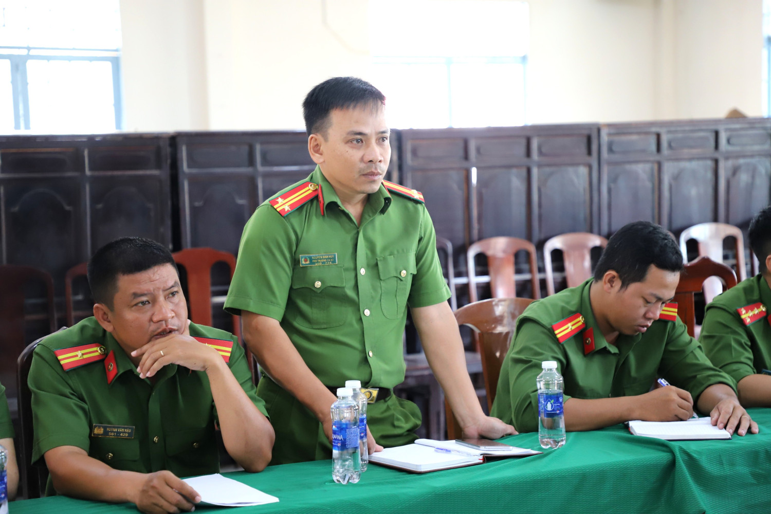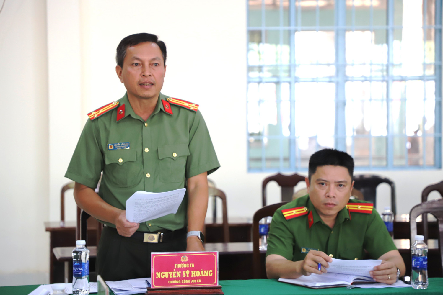 Thượng tá Nguyễn Sỹ Hoàng, Trưởng Công an xã Phú Hữu báo cáo kết quả thực hiện nhiệm vụ của đơn vị