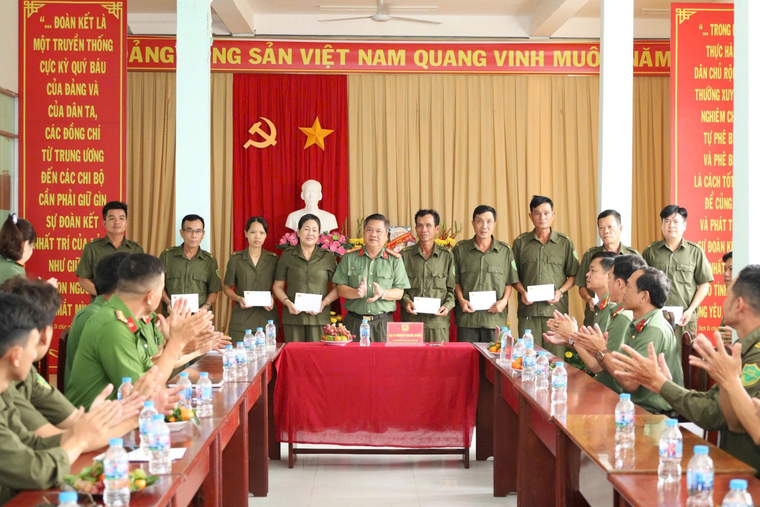 Đại tá Nguyễn Thanh Tràng, Thành ủy viên, Phó Bí thư Đảng ủy, Phó Giám đốc Công an thành phố tặng quà, động viên lực lượng ANTT cơ sở ở Công an các xã Phú Tâm, Vĩnh Thuận Đông và Hỏa Lựu