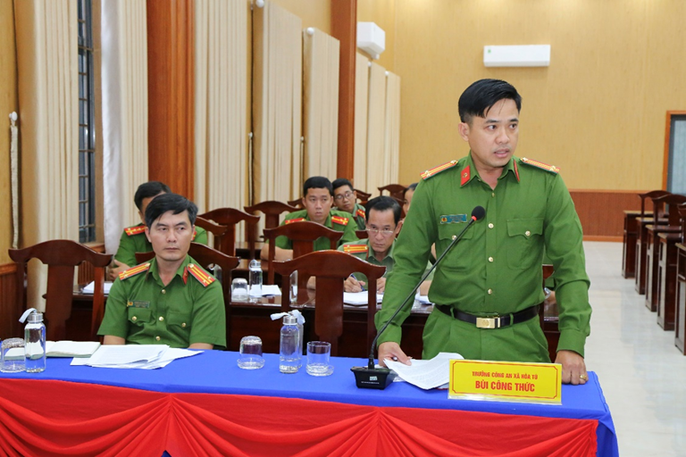Trung tá Bùi Công Thức, Trưởng Công an xã báo cáo kết quả tiến độ thực hiện các chỉ tiêu công tác