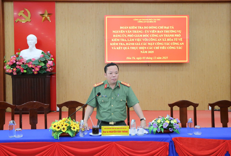 Phát biểu kết luận buổi kiểm tra, Đại tá Nguyễn Văn Thắng, Ủy viên Ban Thường vụ Đảng ủy, Phó Giám đốc Công an thành phố Cần Thơ ghi nhận biểu dương những kết quả đạt được của Công an xã Hòa Tú trong thời gian qua. Đồng chí Phó Giám đốc Công an thành phố đề nghị Công an xã nghiêm túc chấn chỉnh, khắc phục những tồn tại, hạn chế mà đoàn kiểm tra đã chỉ ra. Trong thời gian tới, Công an xã tiếp tục triển khai các chỉ đạo, hướng dẫn của Công an thành phố trong công tác bảo đảm an ninh, trật tự và trật tự an toàn xã hội trên địa bàn; khẩn trương đánh giá toàn diện tình hình an ninh, trật tự trên địa bàn, nhằm kịp thời tham mưu cho Đảng ủy, Ủy ban nhân dân xã lãnh đạo, chỉ đạo công tác bảo đảm an ninh, trật tự trong năm 2026. Đặc biệt, bảo vệ tuyệt đối an toàn ngày Lễ, Tết các sự kiện chính trị quan trọng trên địa bàn. Trong công tác bảo đảm trật tự an toàn xã hội, tiếp tục giữ vững địa bàn xã không ma tuý trong những năm tiếp theo. Tập trung nắm tình hình mâu thuẫn trong nội bộ Nhân dân, nhằm có biện pháp phòng ngừa, không để xảy ra vụ việc phức tạp; làm tốt công tác phong trào toàn dân bảo vệ an ninh Tổ quốc, huy động sức mạnh của cả hệ thống chính trị trong đấu tranh phòng, chống tội phạm, góp phần giữ gìn an ninh chính trị và trật tự an toàn xã hội tại địa phương./.