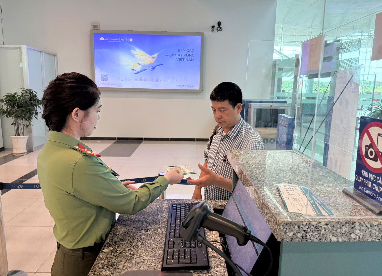 Thực hiện nghiêm túc chỉ đạo của Cục Quản lý xuất nhập cảnh tại Quyết định số 5371 về việc áp dụng biện pháp kiểm soát an ninh hàng không tăng cường cấp độ 1 dịp Lễ 30/4 và 01/5 và các quy định tại Thông tư số 14/2026/TT-BCA ngày 03/02/ 2026 của Bộ trưởng Bộ Công an quy định chi tiết Chương trình an ninh hàng không và kiểm soát chất lượng an ninh hàng không Việt Nam, Phòng Quản lý xuất nhập cảnh đã khẩn trương triển khai các kế hoạch đảm bảo an ninh, an toàn ở mức độ cao nhất. Theo đó, lực lượng An ninh hàng không đã tăng cường tần suất tuần tra, canh gác tại các khu vực hạn chế và các vị trí trọng yếu của cảng hàng không. Công tác soi chiếu, kiểm tra an ninh đối với hành khách và hành lý cũng được siết chặt hơn, đảm bảo quy trình thực hiện liên tục, không ngắt quãng nhằm phát hiện và ngăn chặn kịp thời các nguy cơ tiềm ẩn trong công tác soi chiếu đối với người, hành lý xách tay, hành lý ký gửi và hàng hóa, bưu gửi.