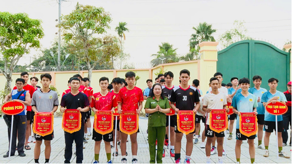 Lãnh đạo Trại Tạm giam số 1, Công an TP Cần Thơ tặng cờ lưu niệm cho các đội tham gia Giải bóng chuyền nam.