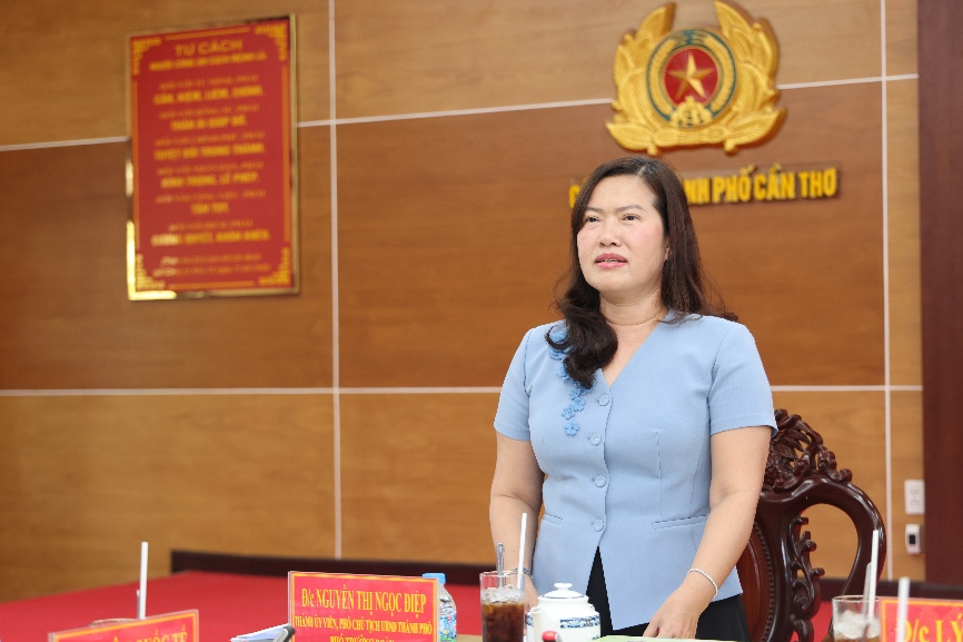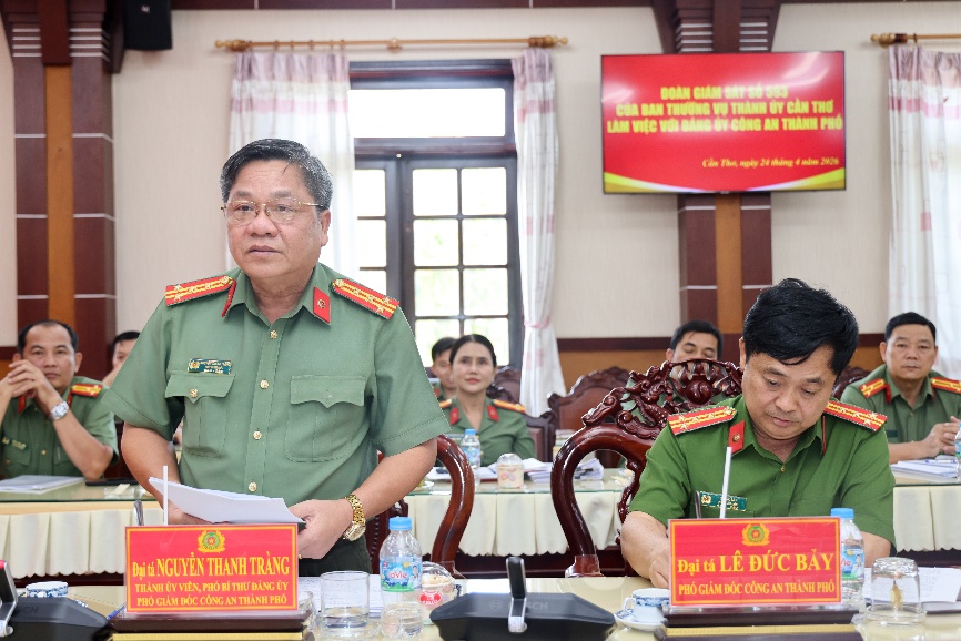 Đại tá Nguyễn Thanh Tràng, Thành ủy viên, Phó Bí thư Đảng ủy, Phó Giám đốc Công an TP. Cần Thơ phát biểu tại buổi làm việc