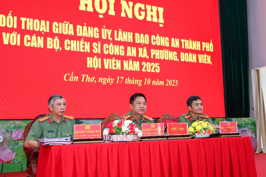 Sáng 17/10, tại Hội trường Công an thành phố Cần Thơ, Đảng ủy, Ban Giám đốc Công an thành phố tổ chức Hội nghị đối thoại giữa Đảng ủy, lãnh đạo Công an thành phố với cán bộ, chiến sĩ Công an xã, phường và đoàn viên, hội viên năm 2025.