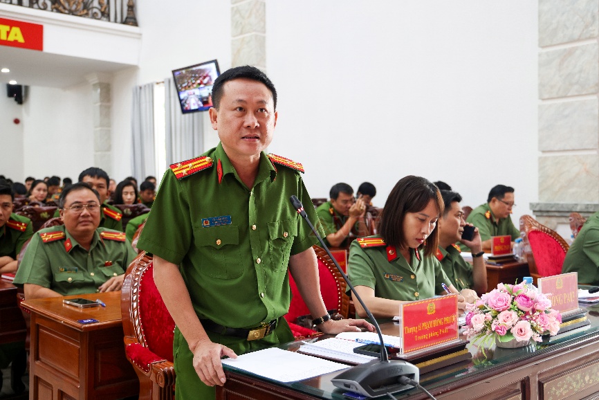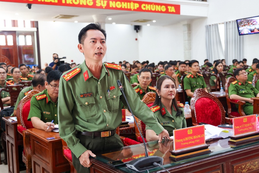 Thượng tá Dương Hoàng An, Trưởng phòng Tổ chức cán bộ giải đáp các câu hỏi của cán bộ, chiến sĩ, đoàn viên, hội viên Công an xã, phường và các phòng nghiệp vụ đặt ra