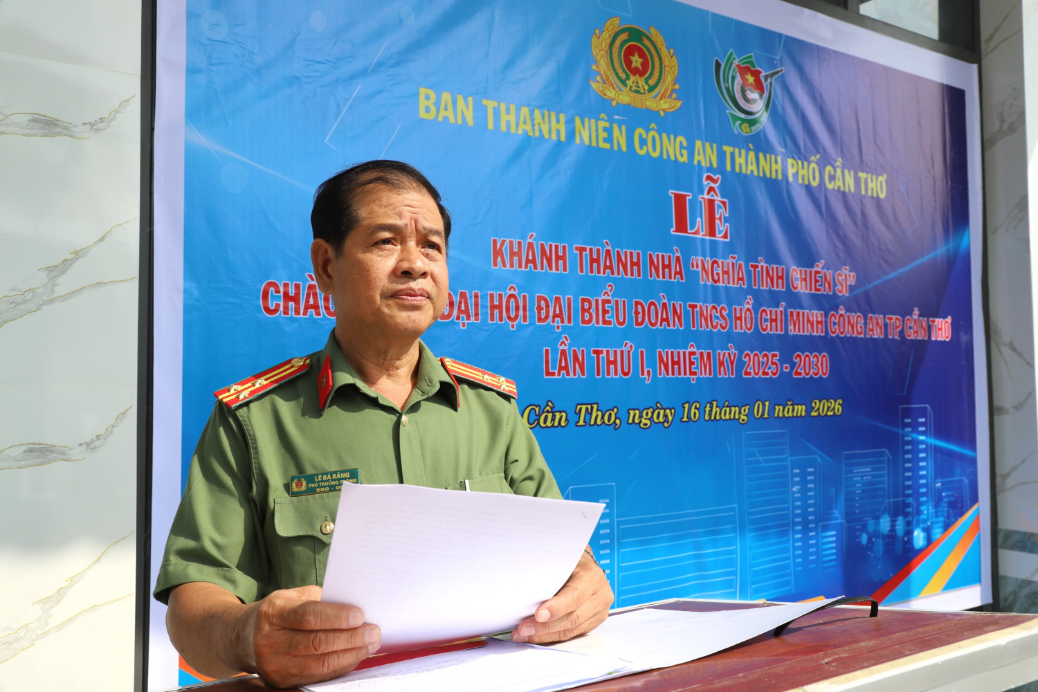 Thượng tá Lê Bá Răng, Phó Trưởng phòng, phòng Công tác chính trị Công an thành phố Cần Thơ phát biểu tại lễ khánh thành