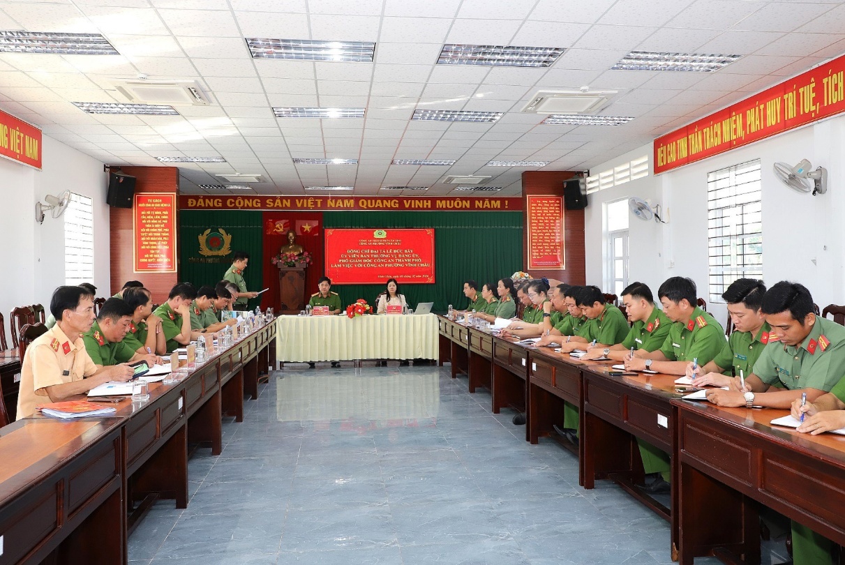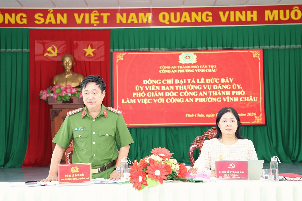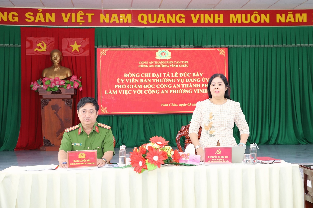 Ngày 03/02, Đại tá Lê Đức Bảy, Ủy viên Ban Thường vụ Đảng ủy, Phó Giám đốc Công an thành phố Cần Thơ cùng đoàn công tác đã đến làm việc với Công an phường Vĩnh Châu về kết quả triển khai thực hiện các mặt công tác Công an trên địa bàn. Cùng dự buổi làm việc có đồng chí Nguyễn Thị Hòa Bình, Phó Bí thư Đảng ủy, Chủ tịch UBND phường Vĩnh Châu.