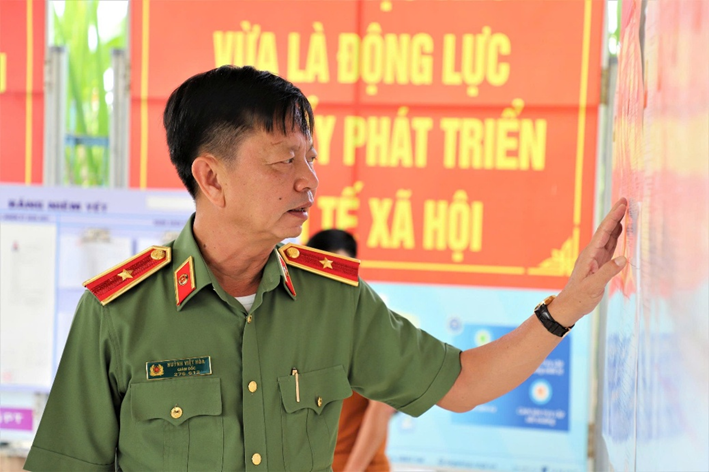 Đồng chí Thiếu tướng Huỳnh Việt Hòa, Ủy viên Ban Thường vụ Thành ủy, Bí thư Đảng ủy, Giám đốc Công an thành phố, Trưởng Ban bầu cử số 11 kiểm tra Bảng niêm yết danh sách nhân sự ứng cử