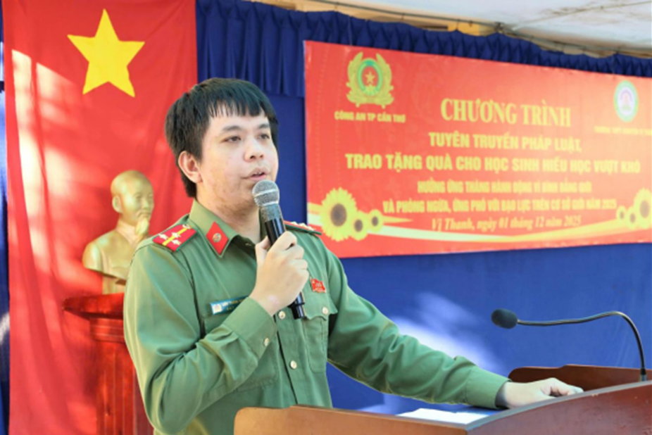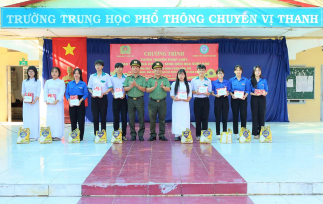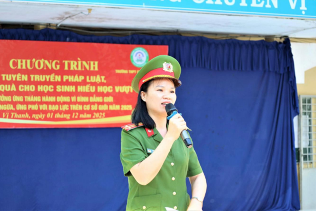 Nhằm thiết thực hưởng ứng Tháng bình đẳng giới năm 2025, sáng ngày 01/12, tại Trường THPT Chuyên Vị Thanh, Ban Phụ nữ Công an thành phố Cần Thơ phối hợp Công an phường Vị Thanh tổ chức chương trình tuyên truyền kỹ năng phòng, chống bạo lực học đường, xâm hại trẻ em, các biện pháp bảo vệ trẻ em trên không gian mạng và tặng quà cho các em học sinh Trường THPT Chuyên Vị Thanh.
