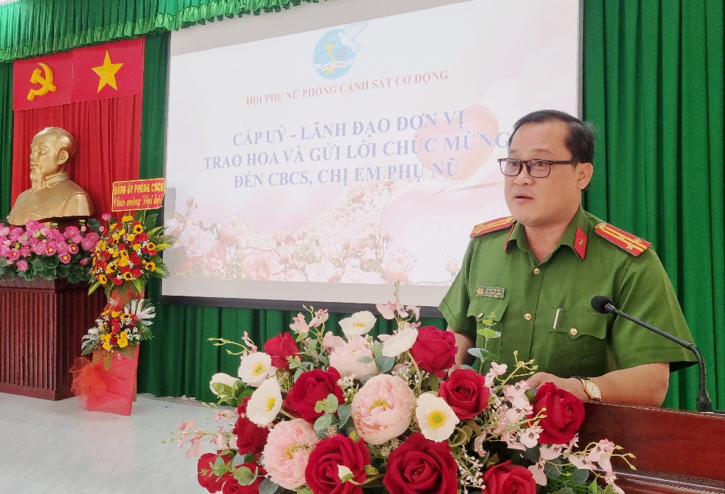 Phát biểu tại buổi họp mặt, đồng chí Thượng tá Huỳnh Thế Anh, Phó Bí thư Đảng ủy, Chủ nhiệm UBKT Đảng ủy, Phó Trưởng phòng Cảnh sát cơ động ghi nhận, biểu dương những kết quả mà Hội Phụ nữ cơ sở đã đạt được trong thời gian qua, đặc biệt là tinh thần “Đoàn kết - Bản lĩnh - Trí tuệ - Nhân văn - Sáng tạo” của hội viên trong thực hiện các phong trào thi đua và thực hiện tốt nhiệm vụ chuyên môn của đơn vị; định hướng Hội tiếp tục phát huy vai trò trong các hoạt động phong trào phụ nữ, các mô hình, công trình, phần việc, góp phần xây dựng lực lượng Cảnh sát cơ động thật sự trong sạch, vững mạnh, chính quy, tinh nhuệ, hiện đại, đáp ứng yêu cầu bảo đảm an ninh, trật tự trong tình hình mới.