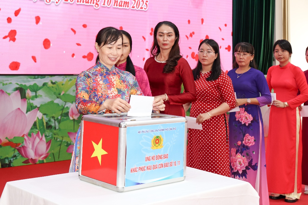 Hưởng ứng lời kêu gọi của Ủy ban Trung ương Mặt trận Tổ quốc Việt Nam; Hội Phụ nữ Bộ Công an, Hội Liên hiệp Phụ nữ thành phố Cần Thơ về việc ủng hộ đồng bào bị thiệt hại do bão, lũ; với truyền thống đạo lý tốt đẹp của dân tộc và tinh thần “tương thân, tương ái”, “lá lành đùm lá rách”, “Công an nhân dân vì nước quên thân, vì dân phục vụ”, “tình dân tộc, nghĩa đồng bào”, tại chương trình họp mặt, Phụ nữ Công an thành phố đã tổ chức Lễ phát động ủng hộ đồng bào khắc phục hậu quả cơn bão số 10 và 11 nhằm kịp thời chia sẻ, động viên, hỗ trợ đồng bào vùng bị ảnh hưởng bão vượt qua khó khăn, sớm ổn định cuộc sống.