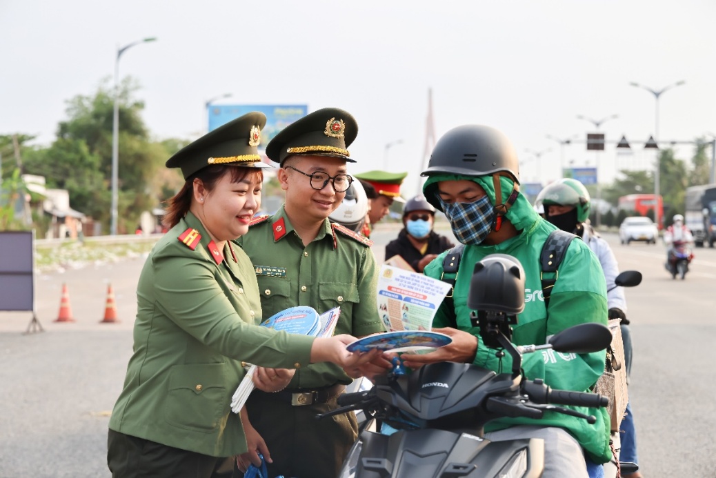 Cán bộ, chiến sĩ phát tờ rơi tuyên truyền và hướng dẫn người dân phòng ngừa các loại tội phạm