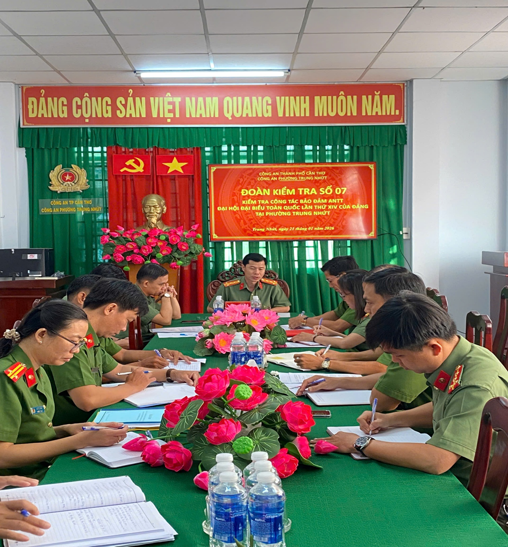 Theo đó, tại trụ sở Công an phường Thốt Nốt, Đoàn kiểm tra số 6 của Công an thành phố Cần Thơ do Đại tá Trần Hoàng Độ, Phó Giám đốc Công an thành phố làm Trưởng đoàn đã tiến hành kiểm tra công tác bảo đảm an ninh, trật tự Đại hội đại biểu toàn quốc lần thứ XIV của Đảng đối với Công an các xã, phường: Thốt Nốt, Thuận Hưng, Phước Thới và Đông Hiệp. Qua kiểm tra thực tế và báo cáo của các đơn vị, Đoàn kiểm tra ghi nhận Công an các xã, phường đã chủ động quán triệt, triển khai nghiêm túc các kế hoạch, phương án của Công an thành phố; bố trí lực lượng trực 100% quân số, chuẩn bị đầy đủ vũ khí, công cụ hỗ trợ, phương tiện và các điều kiện cần thiết, sẵn sàng bảo đảm an ninh, trật tự trước, trong và sau Đại hội. Cùng ngày, Đoàn kiểm tra số 7 của Công an thành phố Cần Thơ do đồng chí Đại tá Nguyễn Thanh Bình, Ủy viên Ban Thường vụ Đảng ủy, Phó Giám đốc Công an thành phố làm Trưởng đoàn đã tiến hành kiểm tra công tác bảo đảm an ninh, trật tự Đại hội đại biểu toàn quốc lần thứ XIV của Đảng tại Công an phường Trung Nhứt. Qua kiểm tra, Đoàn công tác đánh giá Công an phường Trung Nhứt đã triển khai đồng bộ, hiệu quả các biện pháp công tác; chủ động nắm chắc tình hình địa bàn, quản lý đối tượng; làm tốt công tác phòng ngừa, đấu tranh với các loại tội phạm; duy trì nghiêm túc chế độ trực ban, trực chiến; thực hiện chặt chẽ công tác quản lý cư trú, vũ khí, vật liệu nổ, công cụ hỗ trợ và phối hợp chặt chẽ với các lực lượng liên quan, góp phần giữ vững ổn định an ninh, trật tự trên địa bàn.