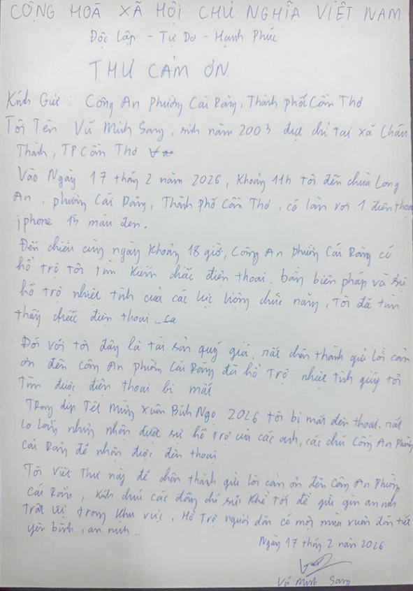 Thư Cảm ơn của anh Vũ Minh Sang gửi đến lực lượng Công an phường Cái Răng