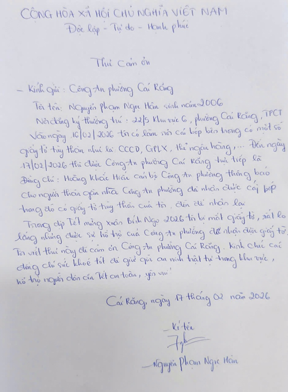 Trong ngày mùng 1 Tết Nguyên đán Bính Ngọ, Công an phường Cái Răng, thành phố Cần Thơ đã nhanh chóng xác minh, tìm kiếm và trao trả tài sản, giấy tờ quan trọng cho người dân bị đánh rơi; những lá thư cảm ơn gửi đến sau đó là sự ghi nhận rõ nét đối với tinh thần trách nhiệm, tận tụy của lực lượng Công an cơ sở trong phục vụ Nhân dân.