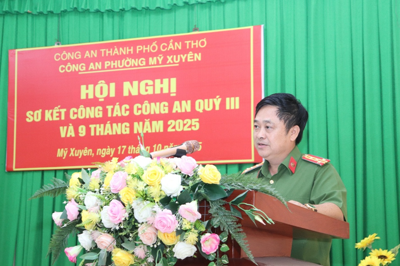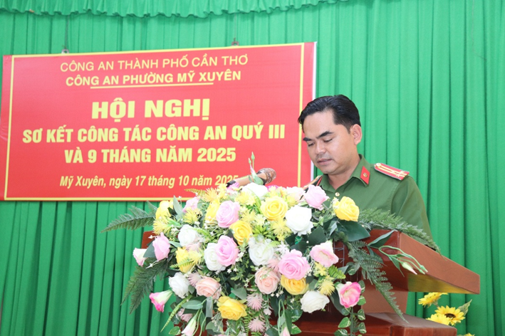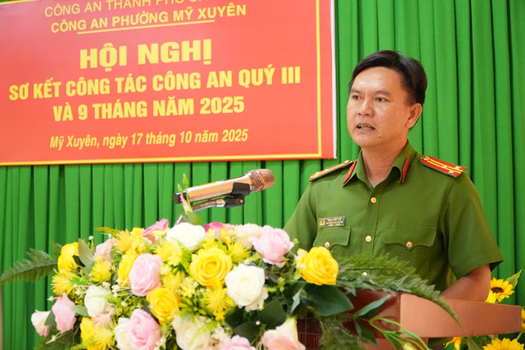 Trưởng Công an phường Mỹ Xuyên báo cáo kết quả công tác Quý III và 09 tháng năm 2025