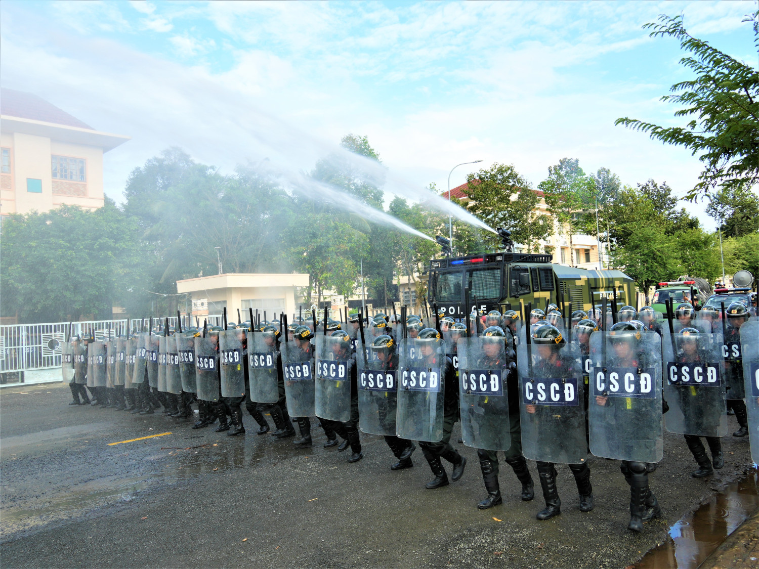 Cán bộ, chiến sĩ Cảnh sát cơ động diễn tập tình huống chống tập trung đông người gây rối an ninh, trật tự