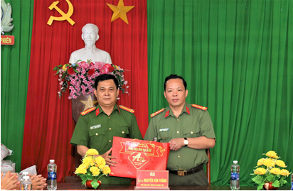 Đại tá Nguyễn Văn Thắng, Uỷ viên Ban Thường vụ Đảng uỷ, Phó Giám đốc Công an thành phố Cần Thơ tặng quà cho Công an xã Xà Phiên