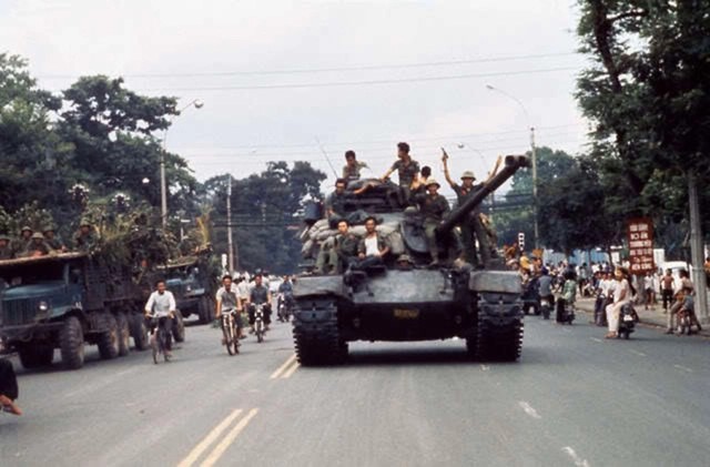 Những chiếc xe tăng đầu tiên đang tiến vào các con đường trung tâm Thành phố Hồ Chí Minh trong buổi sáng ngày 30/4/1975; người dân hai bên đường bắt đầu chen nhau để chào đón Quân Giải phóng