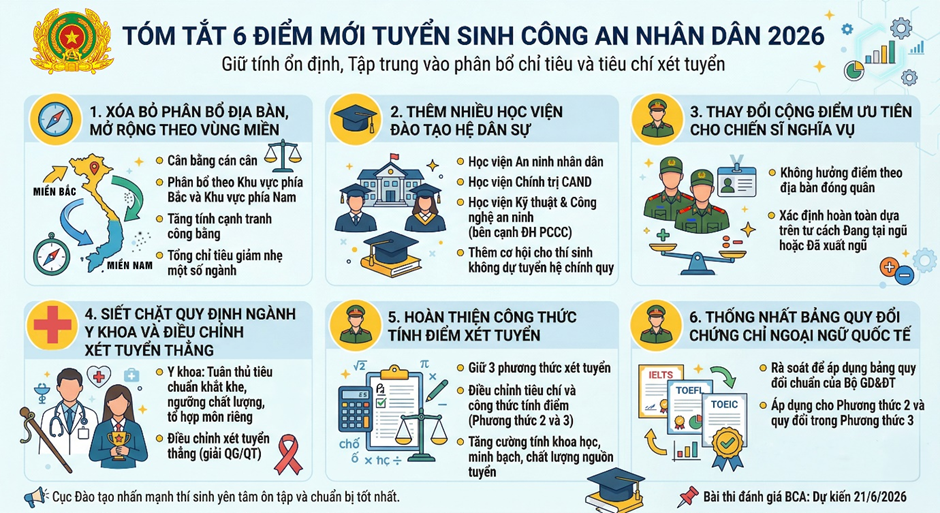 Năm 2026, công tác tuyển sinh vào các học viện, trường Công an nhân dân (CAND) cơ bản được giữ ổn định, tiếp tục duy trì các tổ hợp xét tuyển, bài thi đánh giá của Bộ Công an (dự kiến tổ chức ngày 21/6/2026) cùng ba phương thức tuyển sinh hiện hành. Tuy nhiên, nhằm phù hợp với quy chế chung của Bộ Giáo dục và Đào tạo và yêu cầu thực tiễn của ngành, kỳ tuyển sinh năm nay có một số điều chỉnh quan trọng.