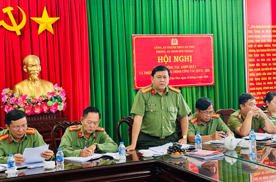 Sáng ngày 16/4/2026, Phòng An ninh đối ngoại, Công an thành phố Cần Thơ tổ chức Hội nghị Sơ kết công tác Quý I và triển khai phương hướng, nhiệm vụ trọng tâm Quý II năm 2026. Thượng tá Nguyễn Thành Nhân, Trưởng phòng chủ trì Hội nghị.