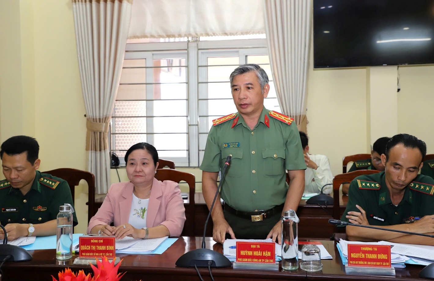 Đại tá Huỳnh Hoài Hận - Phó Giám đốc Công an thành phố phát biểu trong cuộc họp