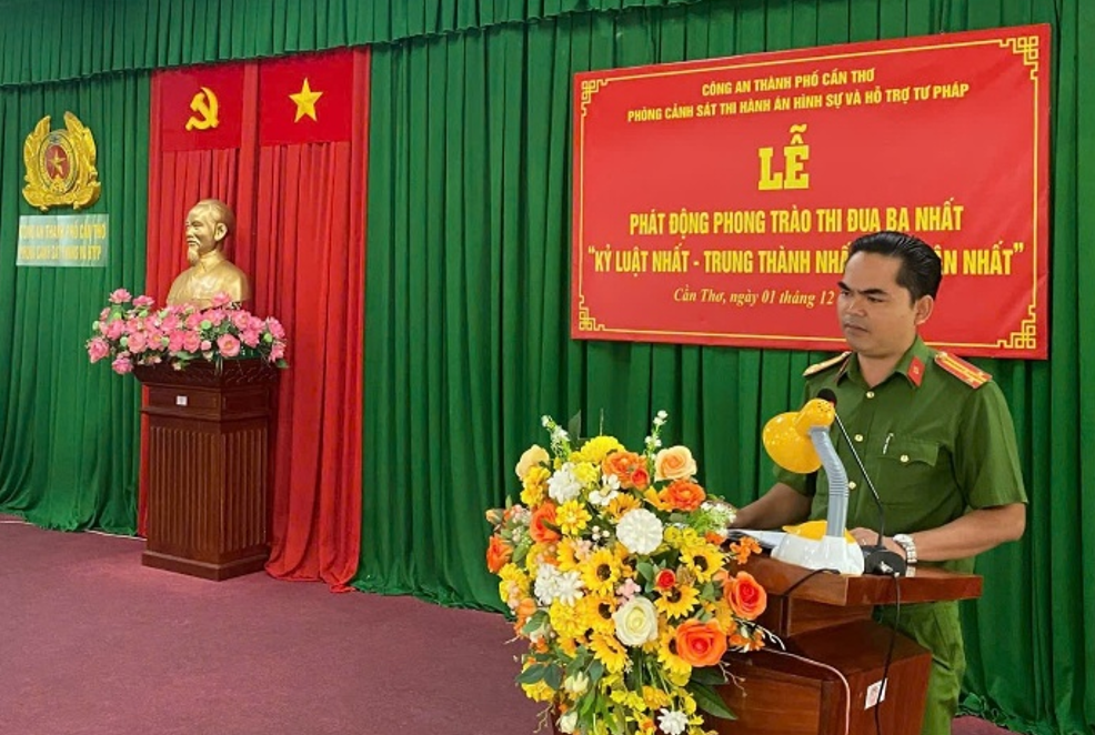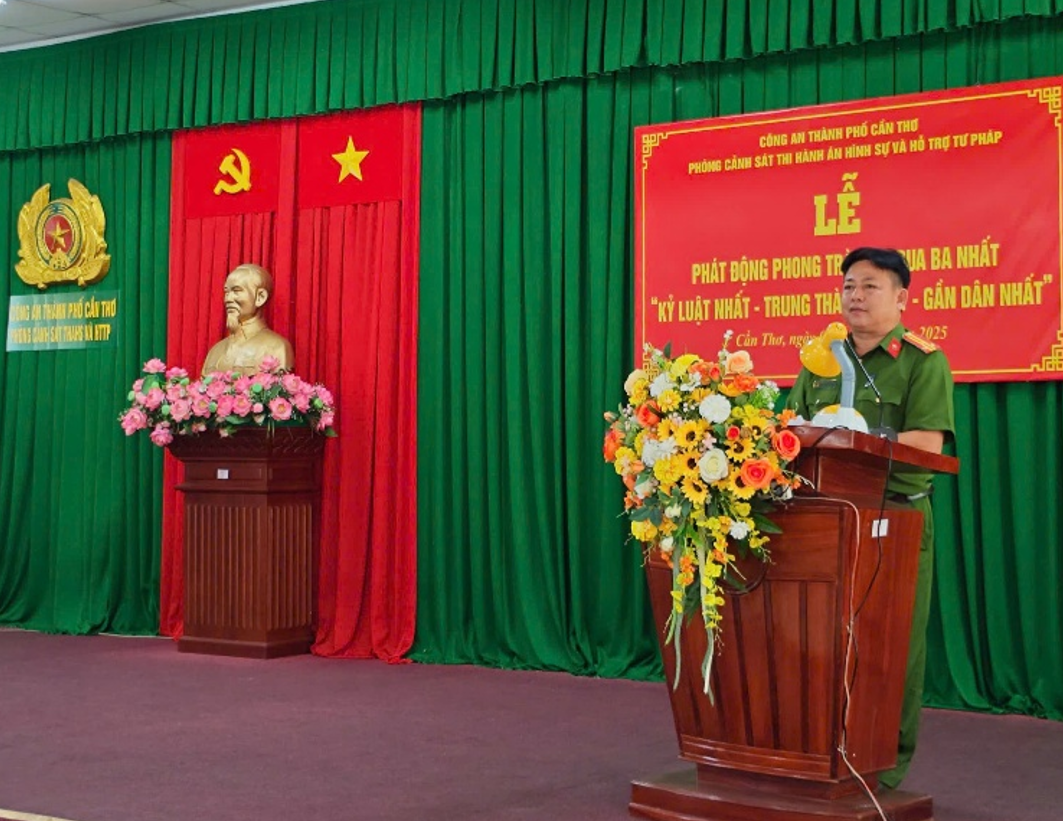 Tại buổi lễ, đồng chí Thượng tá Phạm Thanh Minh - Phó Trưởng phòng Cảnh sát thi hành án hình sự và hỗ trợ tư pháp đã triển khai cụ thể các nội dung thi đua, hướng toàn đơn vị đến việc xây dựng hình ảnh người chiến sĩ Công an nhân dân (CAND) bản lĩnh, nhân văn, kỷ luật, tận tụy, phụng sự Nhân dân. Nội dung của Phong trào thi đua “Ba nhất” được cụ thể hóa rõ ràng: “Kỷ luật nhất” là nội dung nền tảng, tạo nên sức mạnh để xây dựng đơn vị trong sạch, kỷ cương, vững mạnh toàn diện. Đây là biểu hiện cụ thể của nguyên tắc tổ chức Đảng trong CAND, bảo đảm tính thống nhất giữa ý chí và hành động. “Trung thành nhất” là nội dung cốt lõi, thể hiện bản chất cách mạng, phẩm chất cao quý của lực lượng CAND, được khắc sâu trong 05 Lời thề danh dự và là một trong Sáu điều Bác Hồ dạy. Rèn luyện lòng trung thành là yêu cầu cao nhất trong xây dựng lực lượng CAND Việt Nam. “Gần dân nhất” là nội dung làm thước đo, đánh giá tinh thần trọng dân, hiểu dân của CBCS. Sự gần gũi này thể hiện tinh thần “lúc dân cần, lúc dân khó có Công an”, là sự cụ thể hóa quan điểm của Đảng về xây dựng Nhà nước pháp quyền XHCN của dân, do dân, vì dân. Điều này củng cố quan hệ “máu thịt giữa: Đảng - Công an - Nhân dân” và là biện pháp nghiệp vụ như lời Bác Hồ dạy: “Dân giúp ta nhiều thành công nhiều, dân giúp ta ít thành công ít, giúp đỡ ta hoàn toàn thì thắng lợi hoàn toàn”. Phong trào thi đua “Ba nhất” được xác định là trụ cột quan trọng, không chỉ nâng cao chất lượng phong trào “Vì an ninh Tổ quốc” và “Toàn dân bảo vệ an ninh Tổ quốc”, mà còn là thước đo mức độ tin yêu, hài lòng của Nhân dân đối với lực lượng Công an TP Cần Thơ trong giai đoạn mới.