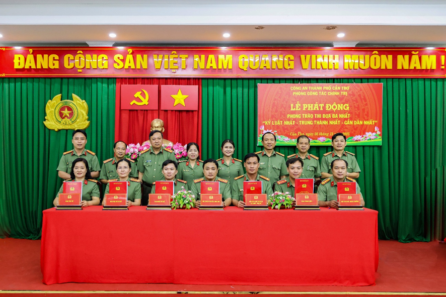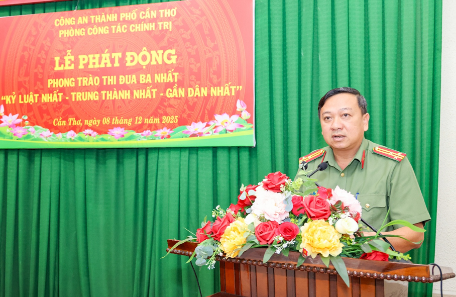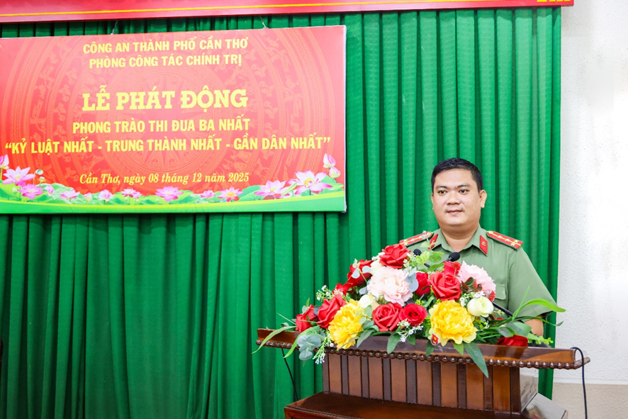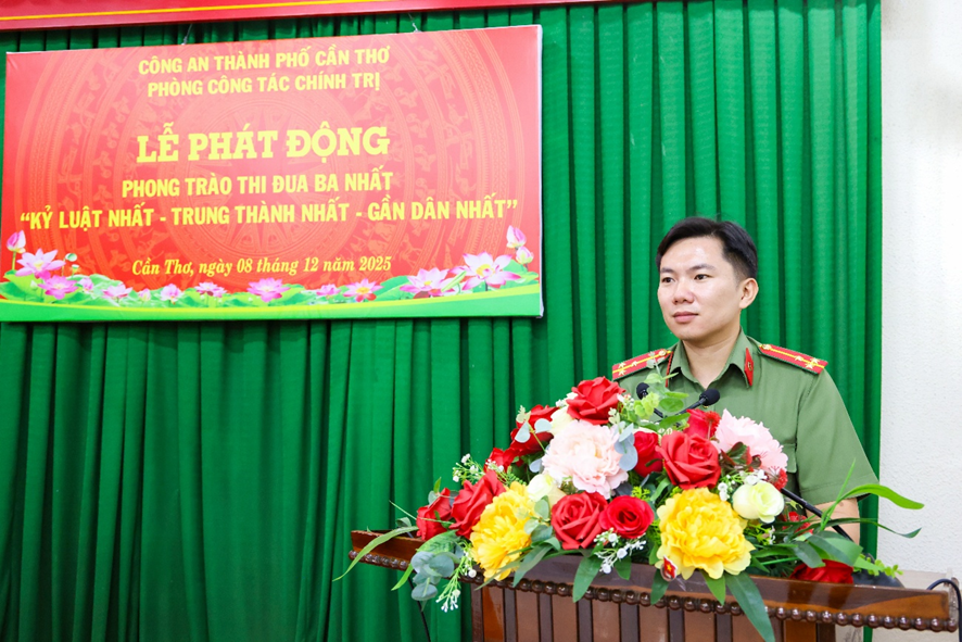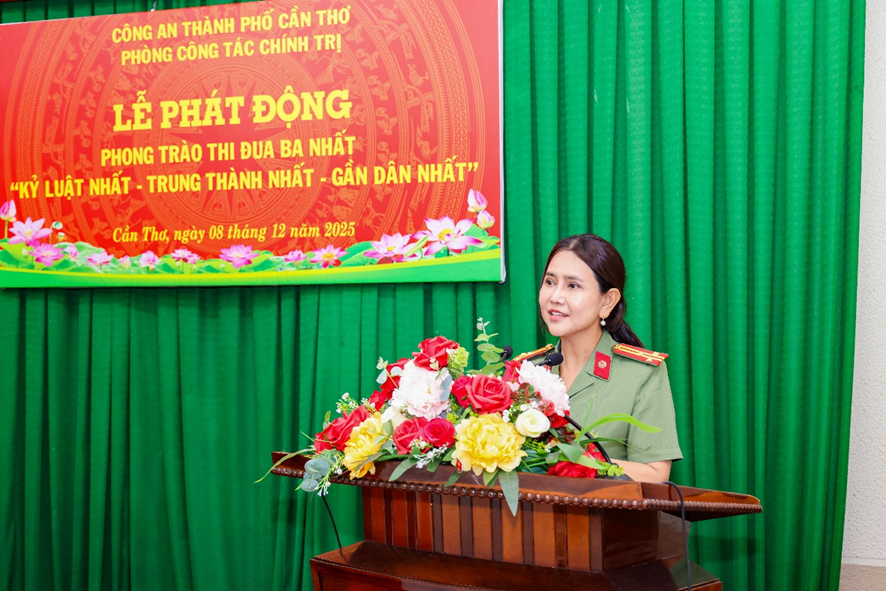 Phát biểu chỉ đạo tại Lễ phát động, Thượng tá Võ Thị Hồng Tiến, Ủy viên Ban Chấp hành Đảng bộ Công an thành phố, Trưởng Phòng Công tác chính trị nhấn mạnh phong trào thi đua “Ba nhất” là nhiệm vụ chính trị đặc biệt quan trọng, tạo động lực để mỗi cán bộ, chiến sĩ không ngừng rèn luyện bản lĩnh, kỷ luật và tinh thần tận tụy phục vụ Nhân dân. Đồng chí yêu cầu các đội, ban chủ động xây dựng chỉ tiêu, đăng ký mô hình, sáng kiến thiết thực; Đoàn Thanh niên và Hội Phụ nữ phát huy vai trò xung kích trong triển khai các công trình, phần việc gắn với nhiệm vụ chuyên môn; cấp ủy, lãnh đạo phải gương mẫu đi đầu, tăng cường kiểm tra, giám sát, biểu dương kịp thời các tập thể, cá nhân tiêu biểu. Đồng chí khẳng định: Phòng Công tác chính trị là cơ quan thường trực tham mưu Đảng ủy, Ban Giám đốc triển khai phong trào thi đua, vì vậy càng phải là đơn vị gương mẫu, đi đầu trong tuyên truyền, lan tỏa và tổ chức thực hiện phong trào “Ba nhất”. Mong rằng toàn thể cán bộ, chiến sĩ tiếp tục phát huy truyền thống của lực lượng, biến ý chí thi đua thành hành động cụ thể, xây dựng hình ảnh Người chiến sĩ Công an nhân dân bản lĩnh, nhân văn, vì Nhân dân phục vụ. Với tinh thần đoàn kết - kỷ luật - sáng tạo, đồng chí tin tưởng tập thể đơn vị sẽ hoàn thành xuất sắc mọi chỉ tiêu phong trào, góp phần vào thành tích chung của Công an thành phố trong giữ vững an ninh, trật tự và xây dựng lực lượng thật sự trong sạch, vững mạnh toàn diện. Lễ phát động phong trào thi đua “Ba nhất” của Phòng Công tác chính trị là đợt sinh hoạt chính trị quan trọng, mang ý nghĩa cổ vũ mạnh mẽ tinh thần trách nhiệm, ý chí chiến đấu và khát vọng cống hiến của cán bộ, chiến sĩ trong giai đoạn phát triển mới của lực lượng. Đồng thời mở đầu cho giai đoạn thi đua cao điểm 2025 - 2030, khẳng định quyết tâm của tập thể đơn vị: xây dựng lực lượng thật sự “Kỷ luật nhất - Trung thành nhất - Gần dân nhất”; góp phần củng cố “thế trận lòng dân”, giữ vững bình yên thành phố Cần Thơ trong kỷ nguyên phát triển mới./.