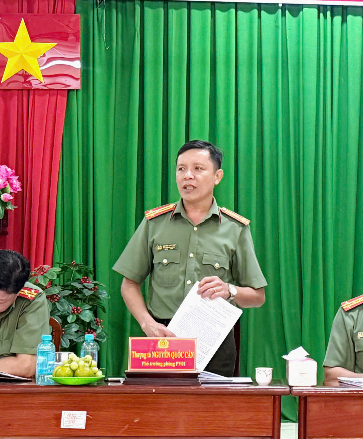 Thượng tá Phạm Quốc Anh, Phó Trưởng phòng phụ trách Phòng Quản lý xuất nhập cảnh tiếp thu ý kiến chỉ đạo của đồng chí Phó Giám đốc Công an thành phố trong buổi làm việc. Ảnh: N.L