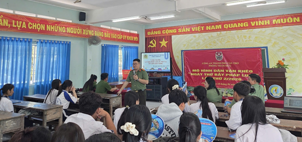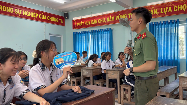 Đồng chí Thượng úy Nguyễn Trúc Lâm, cán bộ Phòng Tham mưu tuyên truyền chuyên đề “Kỹ năng sử dụng mạng xã hội an toàn, phòng chống tội phạm trên không gian mạng”