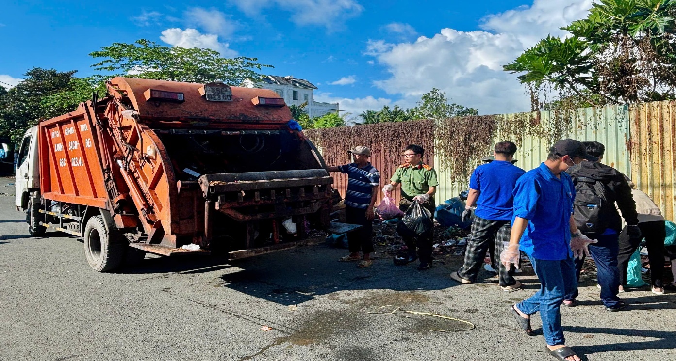 Ảnh: Cán bộ, chiến sĩ Phòng An ninh điều tra phối hợp cùng đoàn viên Phường Thới An Đông tham gia vệ sinh, thu gom rác thải.