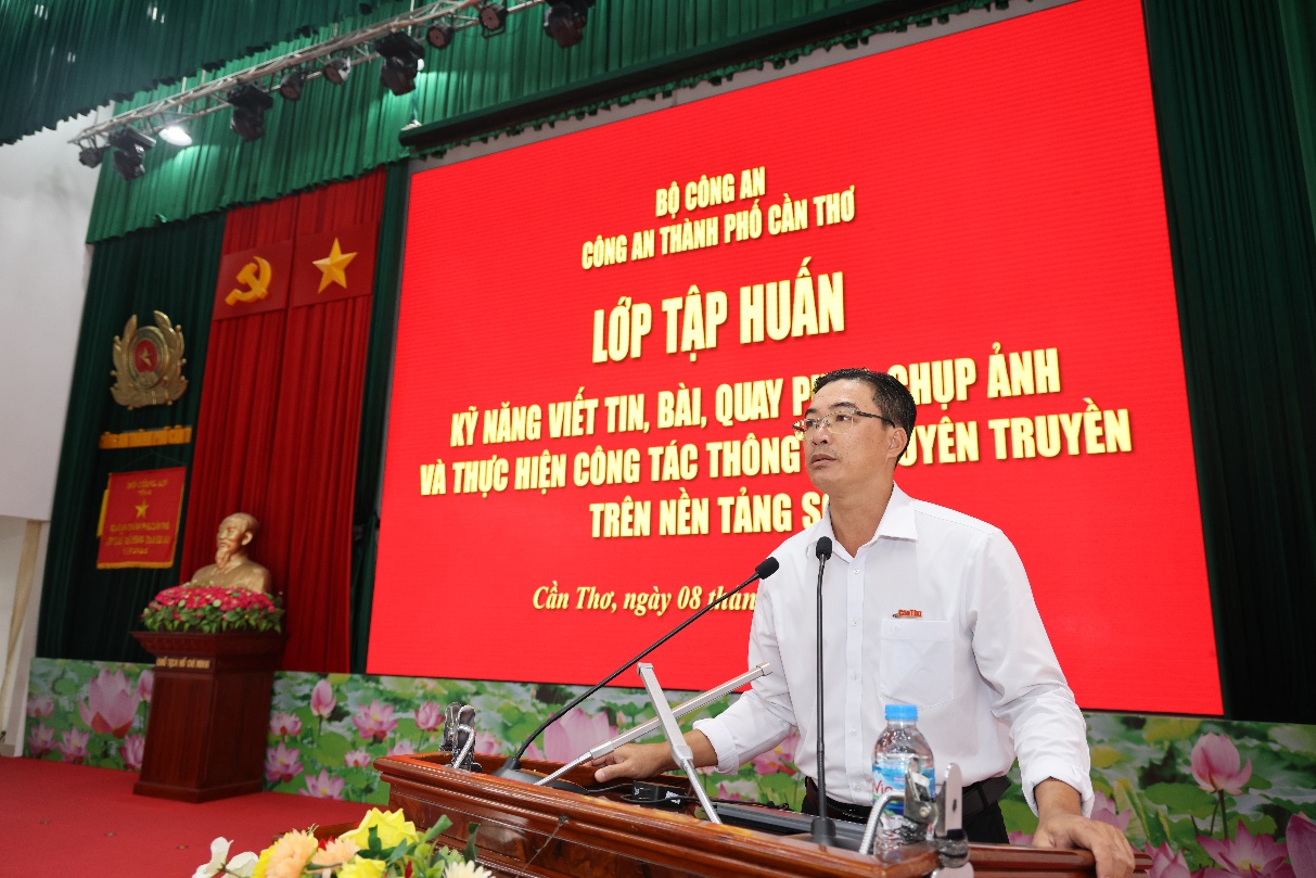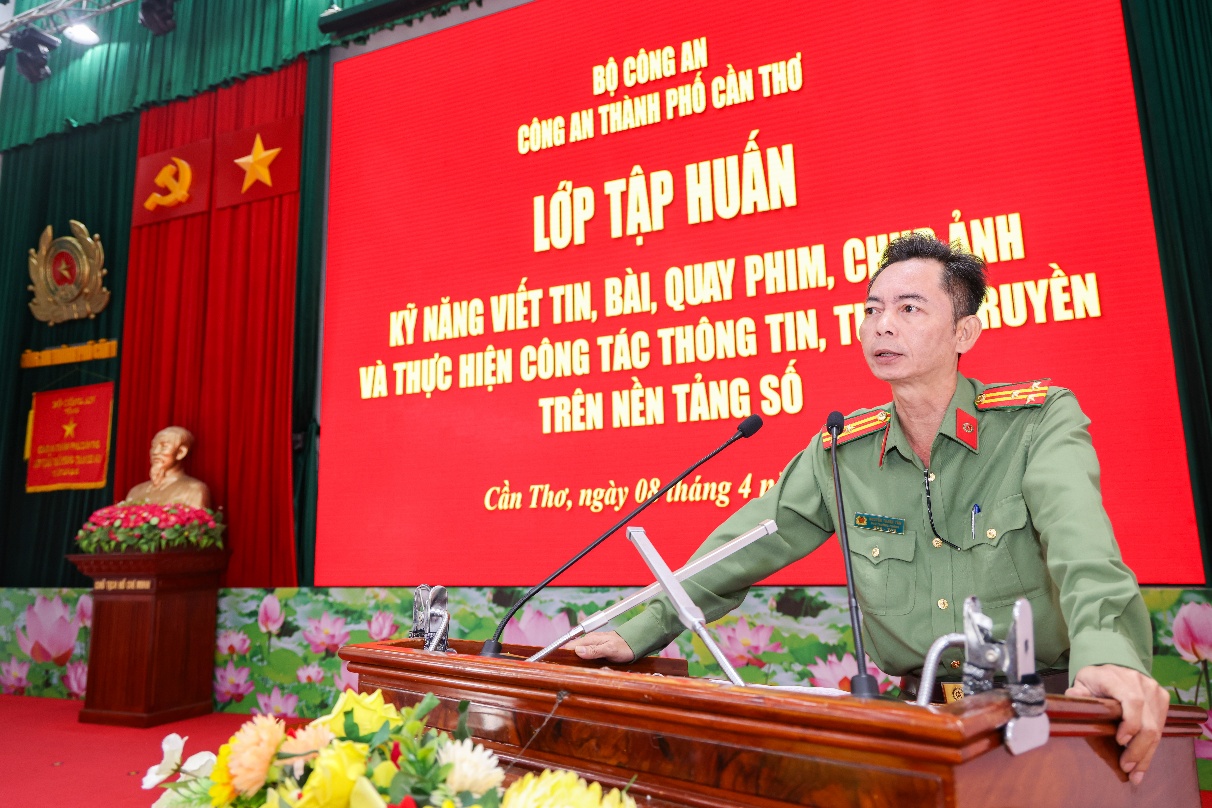 Phát biểu chỉ đạo tại lễ khai giảng, Đại tá Nguyễn Thanh Tràng, Phó Giám đốc Công an thành phố Cần Thơ nhấn mạnh, công tác thông tin, tuyên truyền trong lực lượng Công an nhân dân có vị trí đặc biệt quan trọng, không chỉ kịp thời phản ánh toàn diện các mặt công tác, chiến đấu, xây dựng lực lượng mà còn trực tiếp góp phần định hướng dư luận xã hội, lan tỏa hình ảnh đẹp của người chiến sĩ Công an vì Nhân dân phục vụ; đồng thời là công cụ sắc bén trong đấu tranh phản bác các thông tin xấu, độc, sai trái, thù địch trên không gian mạng. Thời gian qua, công tác tuyên truyền của Công an thành phố Cần Thơ đã có nhiều chuyển biến tích cực, từng bước đi vào nền nếp, phản ánh khá toàn diện các hoạt động của lực lượng; tuy nhiên, vẫn còn một số hạn chế như việc phát hiện đề tài có lúc chưa kịp thời, kỹ năng tác nghiệp của một bộ phận cán bộ còn hạn chế, chất lượng một số sản phẩm tuyên truyền chưa cao, việc ứng dụng nền tảng số còn chưa đồng đều. Trong bối cảnh triển khai mô hình Công an địa phương hai cấp, phạm vi quản lý rộng hơn, yêu cầu nhiệm vụ cao hơn cùng với sự phát triển nhanh của truyền thông số, đồng chí khẳng định việc tổ chức lớp tập huấn lần này là hết sức cần thiết, nhằm trang bị kiến thức, kỹ năng toàn diện cho đội ngũ làm công tác tuyên truyền.