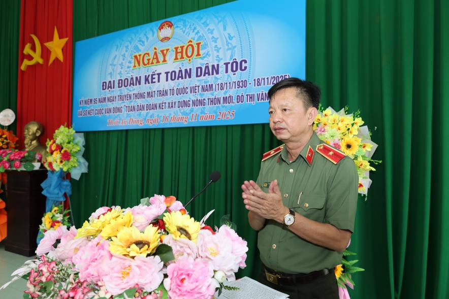 Thiếu tướng Huỳnh Việt Hòa, Ủy viên Ban Thường vụ Thành ủy, Giám đốc Công an thành phố Cần Thơ phát biểu tại Ngày hội Đại đoàn kết toàn dân tộc phường Thới An Đông