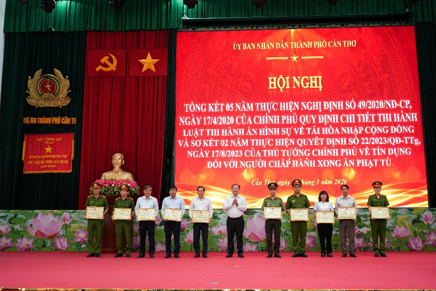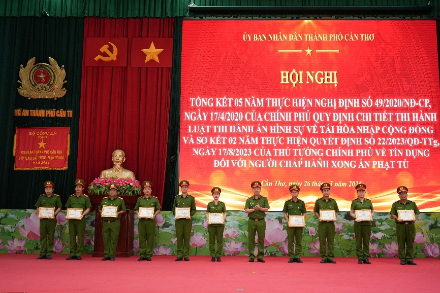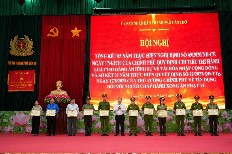 Chiều 26/3, Ủy ban nhân dân thành phố Cần Thơ tổ chức Hội nghị Tổng kết 05 năm thực hiện Nghị định số 49/2020/NĐ-CP của Chính phủ quy định chi tiết thi hành Luật Thi hành án hình sự về tái hòa nhập cộng đồng và sơ kết 02 năm thực hiện Quyết định số 22/2023/QĐ-TTg của Thủ tướng Chính phủ về tín dụng đối với người chấp hành xong án phạt tù. Dự và chỉ đạo Hội nghị có đồng chí Nguyễn Văn Hòa, Phó Chủ tịch Ủy ban nhân dân thành phố, đại diện lãnh đạo các sở, ban, ngành thành phố. Về phía Công an thành phố Cần Thơ, Đại tá Trần Hoàng Độ, Phó Giám đốc Công an thành phố cùng đại diện lãnh đạo một số đơn vị nghiệp vụ, Công an xã, phường tham dự.